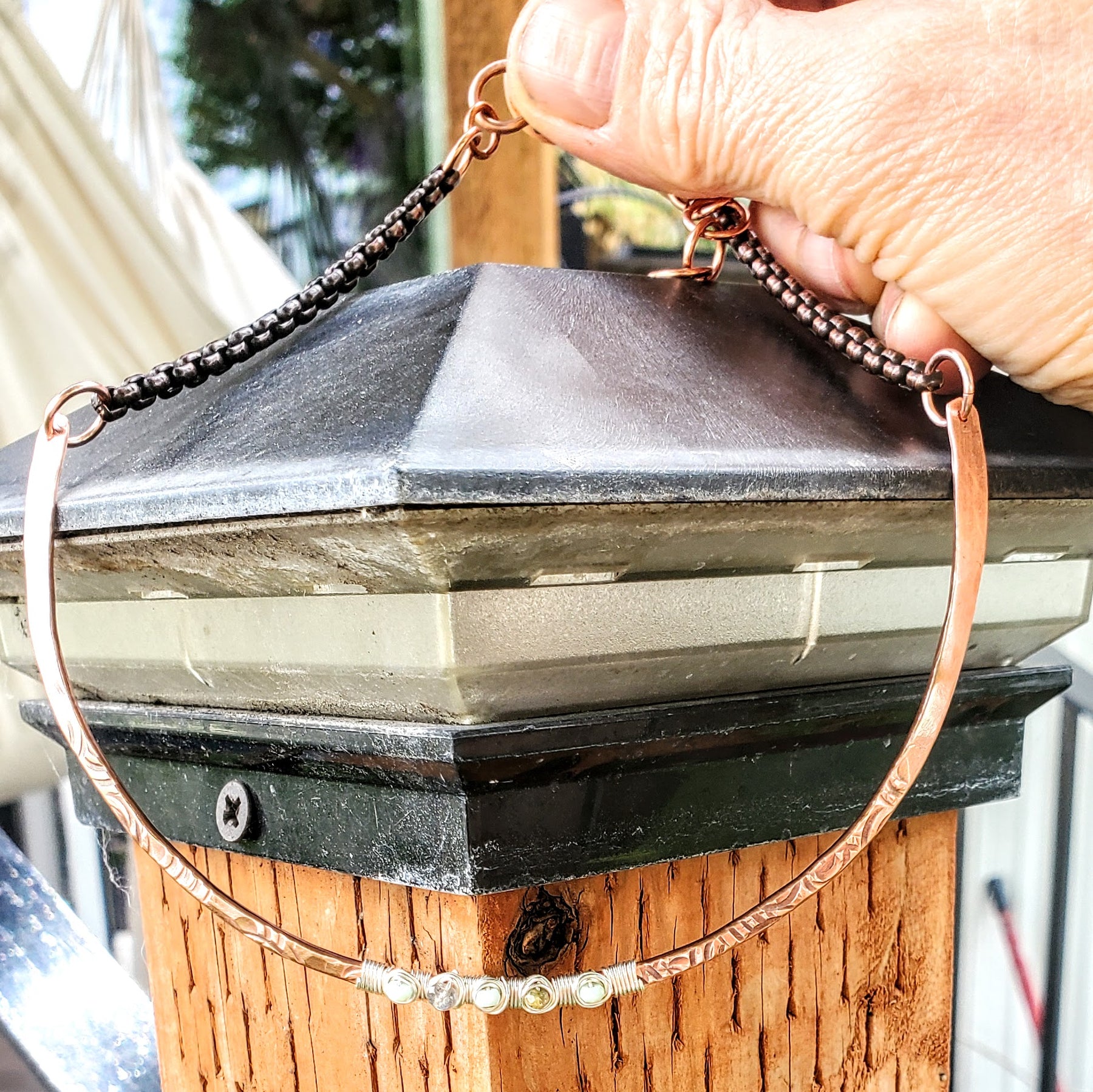 Sterling Silver Wire Wrapping: Several feet of fine 24-gauge sterling silver wire is meticulously wrapped around the copper, securing the gemstones in place while creating an elegant contrast between warm copper and cool silver.