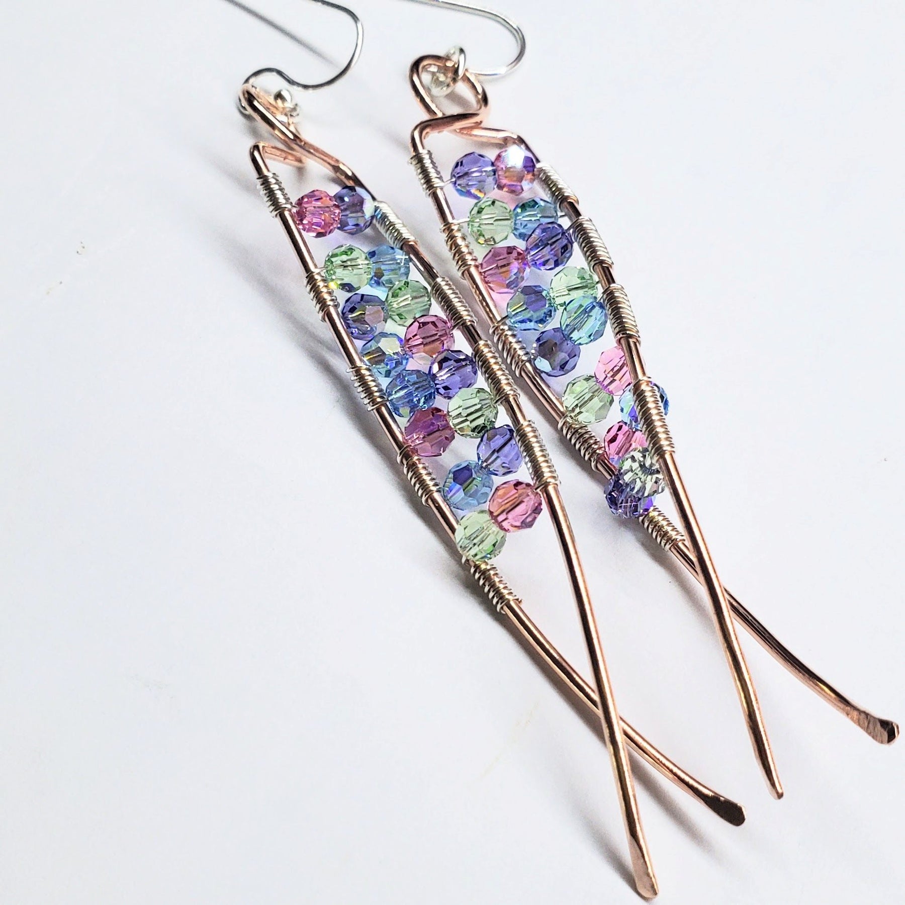 Handmade Copper DNA Strand Double Helix Long Crystal Earrings