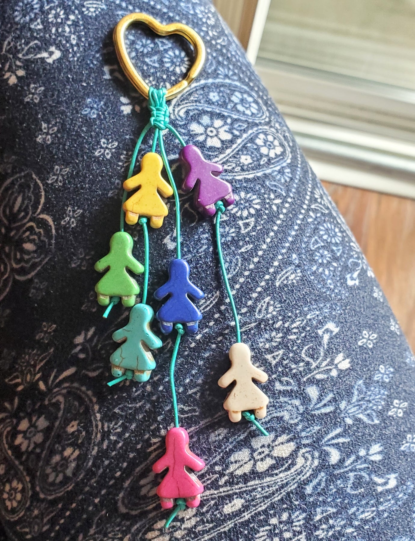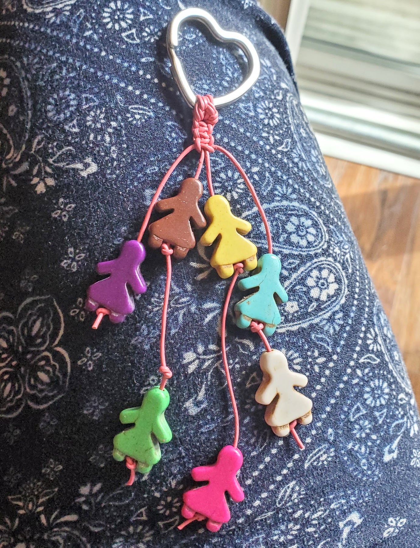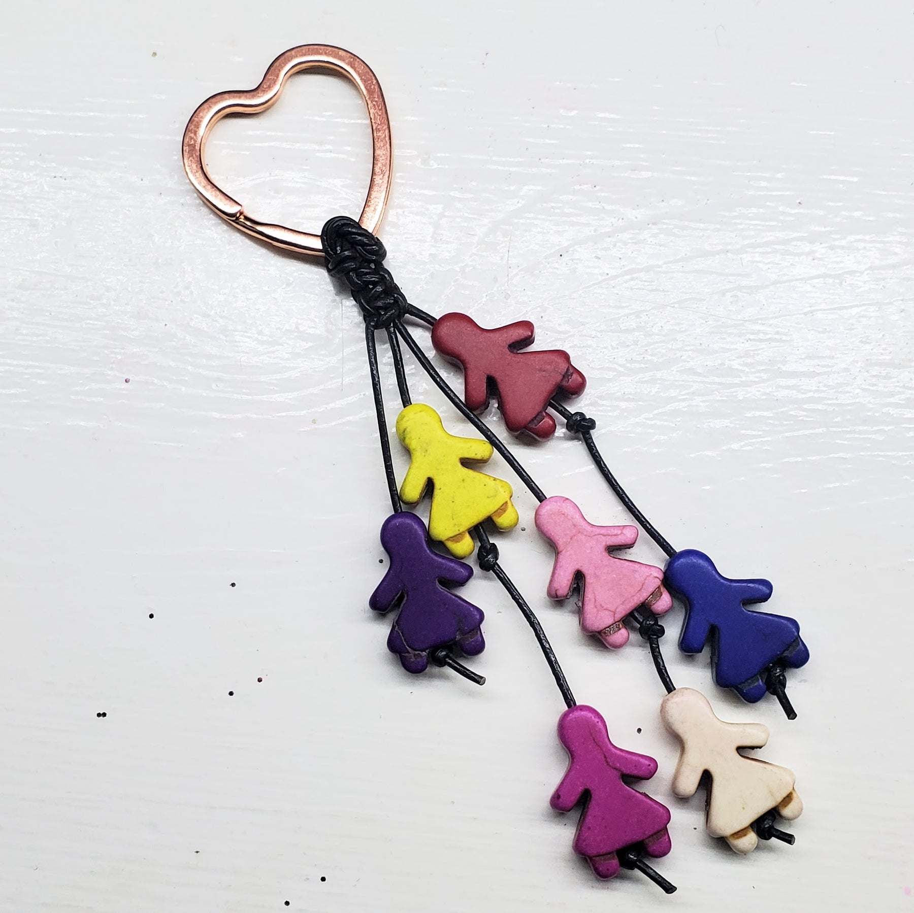 More than a keychain—it's a tribute to womanhood. This handcrafted limited-edition keychain features 7 ceramic girl-shaped beads, each representing an important woman in your life. Woven together with colorful dyed leather and intricate macramé knotwork, this meaningful accessory celebrates the mothers, grandmothers, sisters, daughters, and friends who are woven into your life through love and destiny.