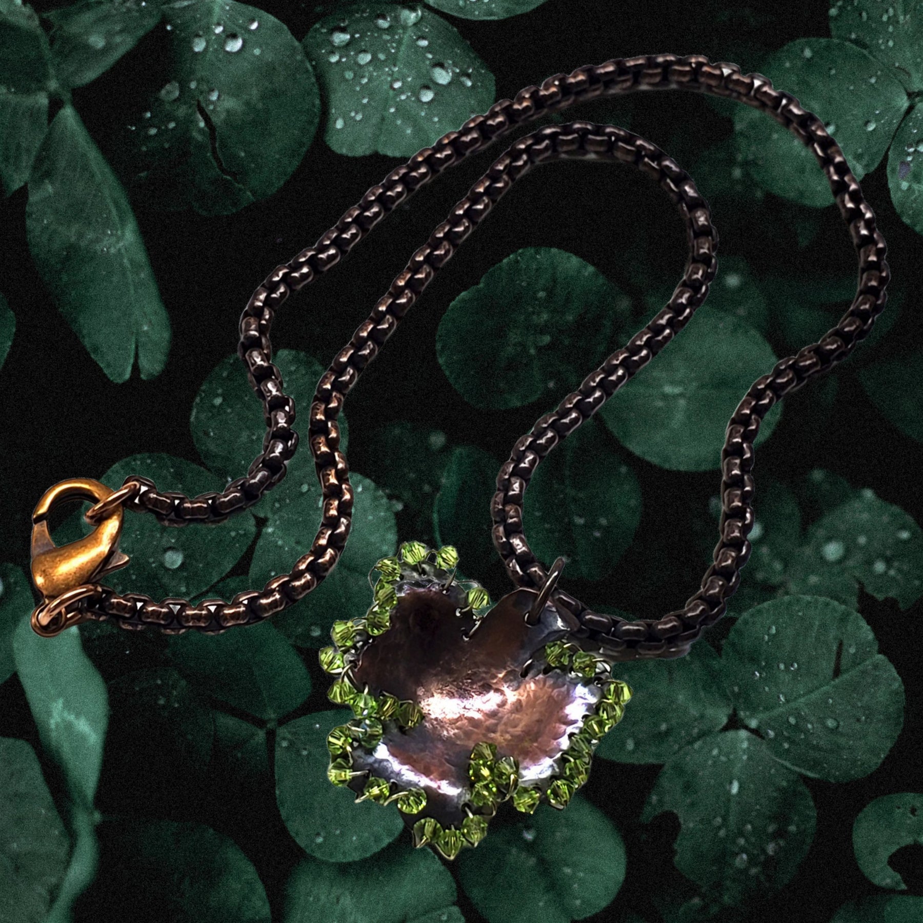 - Pendant: Hand-sculpted 3D shamrock with wire-wrapped crystal accent