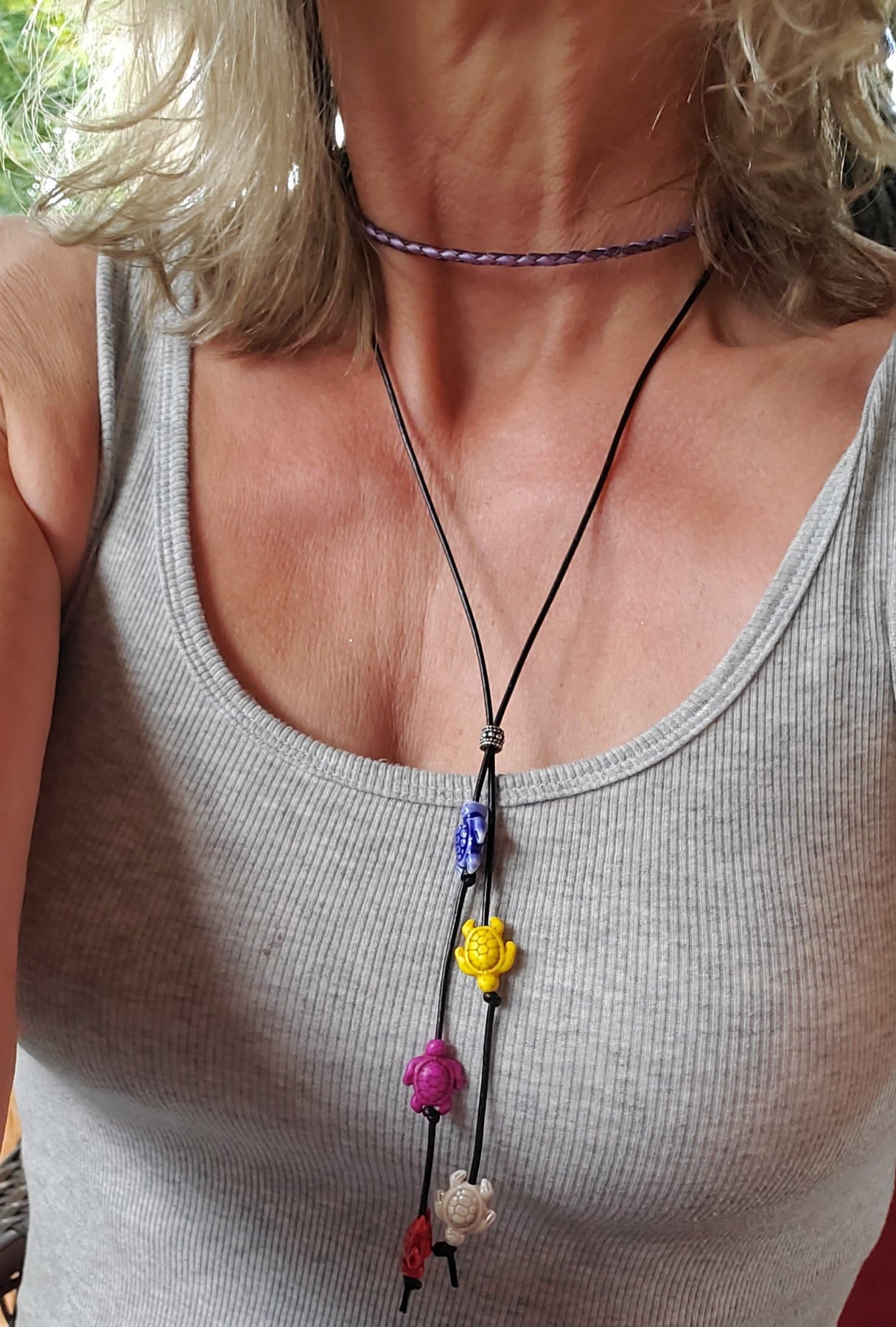 🐢 Handmade Black Leather Colored Ceramic Talking Turtle Bolo Necklace 🐢