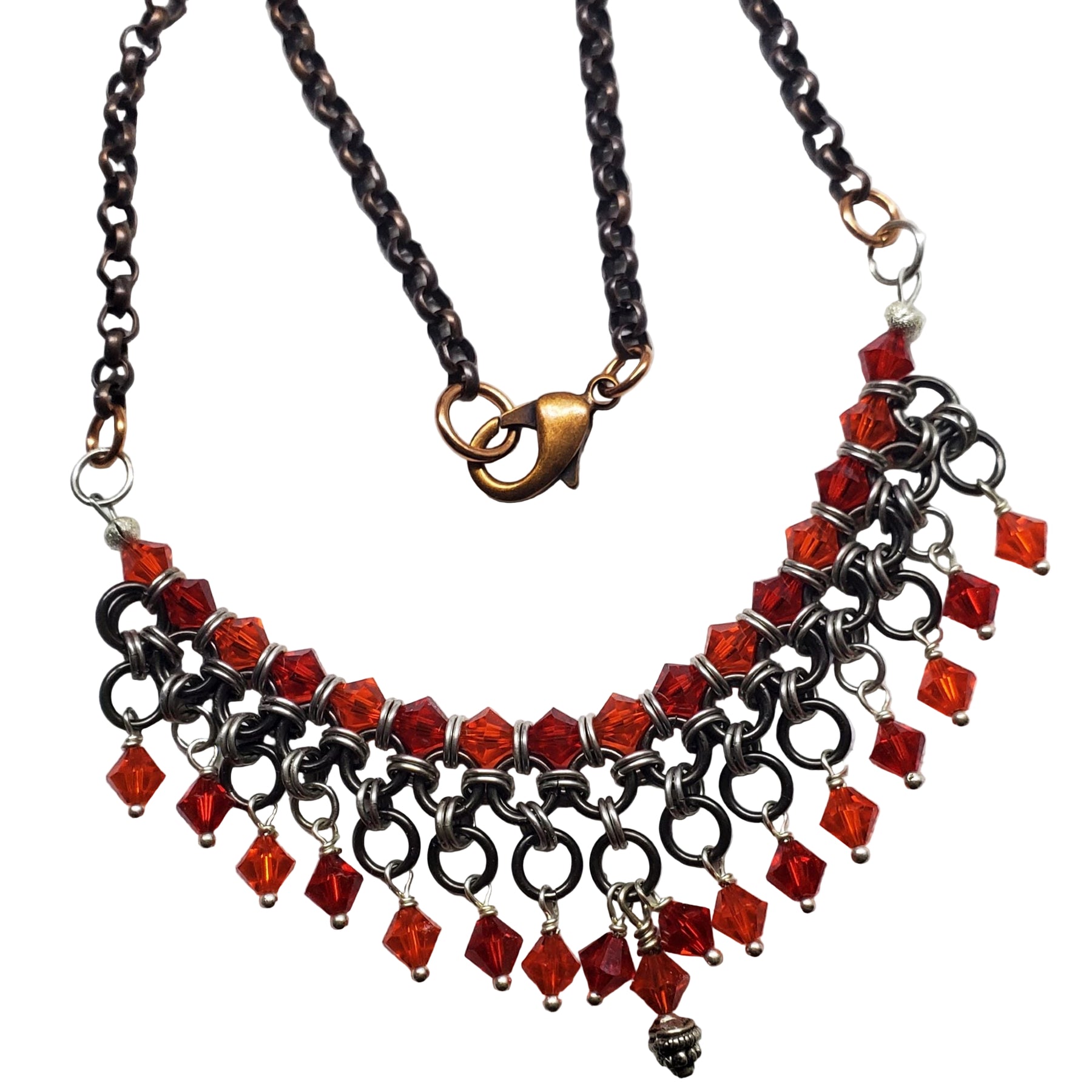 Unleash your inner warrior princess with this stunning original and uniquely designed Mixed Metal Chainmaille Princess Warrior Choker Necklace! Handcrafted with an intricate chainmaille design using 131 interlocking jump rings in antiqued brass, sterling silver, and copper, this necklace is the perfect blend of strength and sparkling beauty. One of the many features is the 33 individual sterling silver dangles adorned with 6mm red and orange Swarovski crystals that resemble and remind you of all the blood spilled by husbands and wives who must leave their families to go to war. The beauty of this necklace is its flexibility and smoothness which also accentuates this one-of-a-kind choker. Make a statement, feel empowered, and get ready to conquer the world!