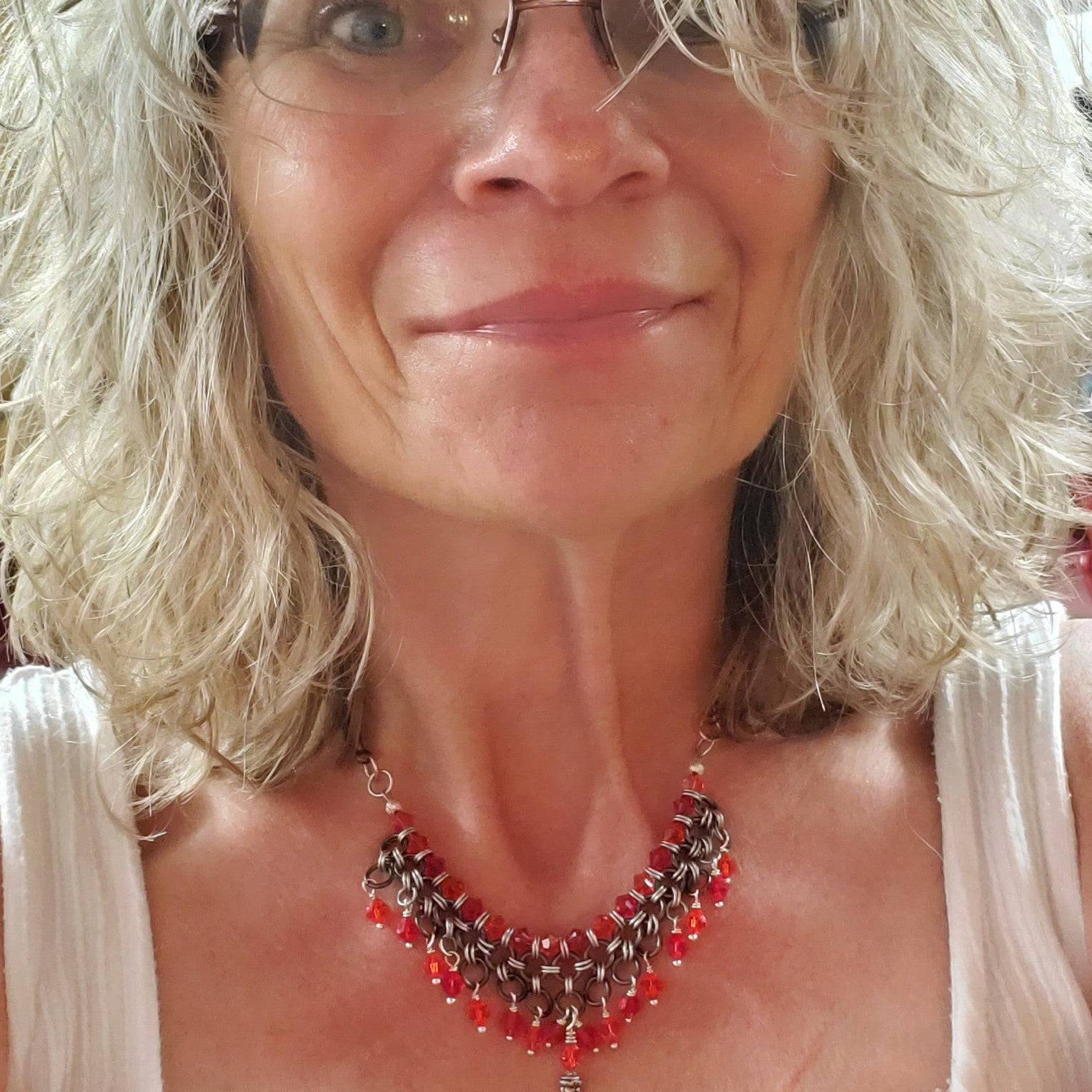 The necklace features 33 Swarovski crystals in red and orange: