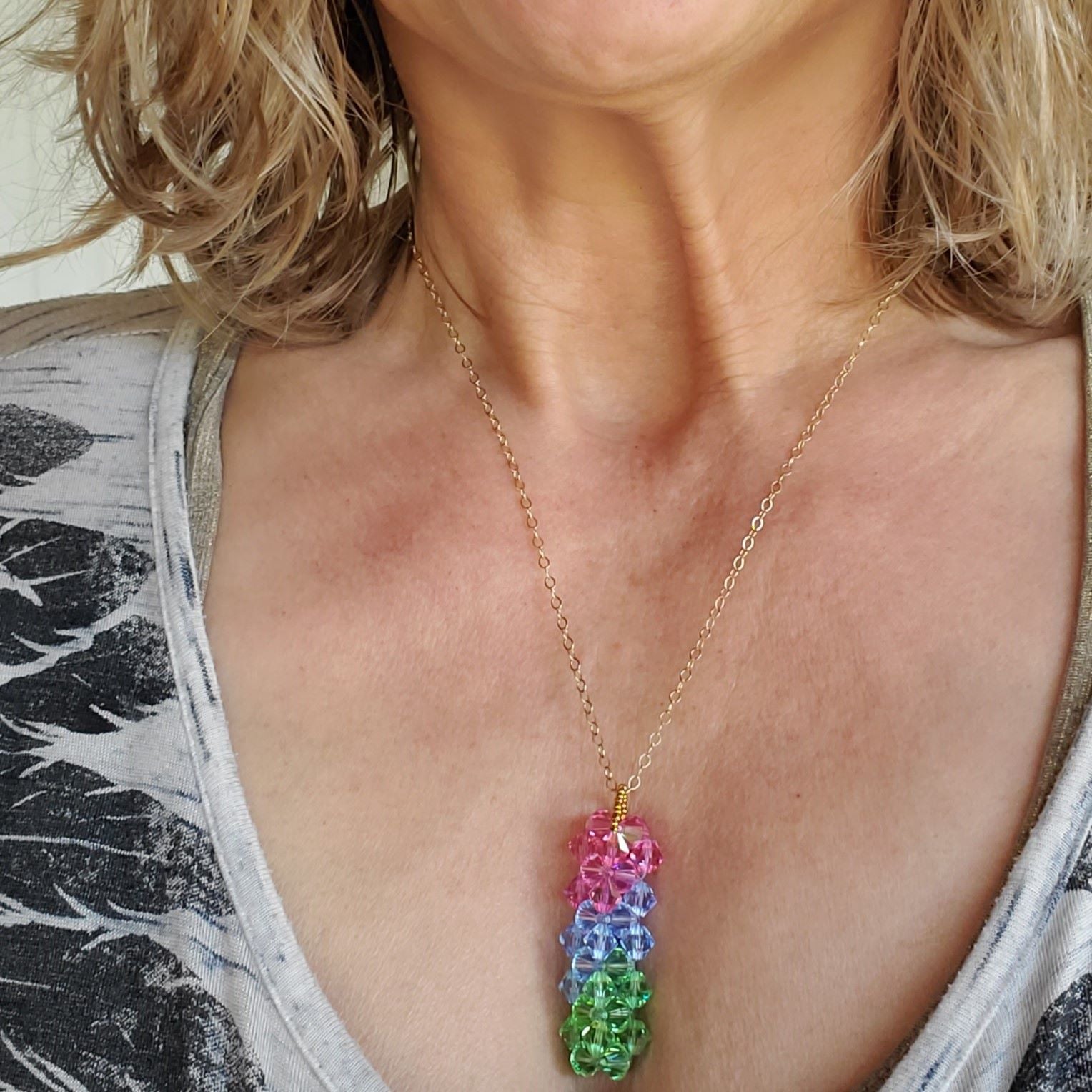 This Super Sparkly Green Blue Rose Happy Colors Crystal Pillar Pendant is truly beautiful and was designed to help celebrate every day, no matter what it entails! This most sought-after color combination reminds us of the true beauty of life and not to let circumstances dictate our lives. The pendant features a unique 3-D pillar design adorned with warm rose, green, and blue Swarovski Crystals to soothe your inner turbulence on difficult days. This bead-woven geometrical pillar—which can only be done with Swarovski crystals due to their accurate cut—also reminds us of the steadfastness of our Heavenly Father who was a pillar to the Israelites as He is to every believer today. This stunning pillar exudes elegance and grace, making it the perfect accessory for any occasion. Make a statement with this breathtaking 3-D alluring piece that will leave everyone breathless!