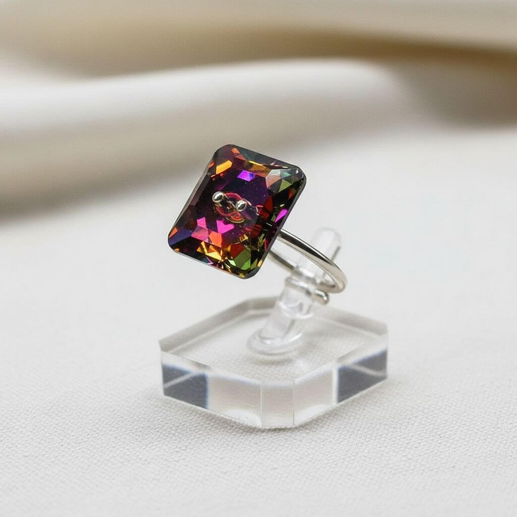 Make a bold statement with this stunning Volcano Crystal Button Ring—a dazzling piece featuring a large square Swarovski volcano crystal button set in sterling silver. This artisan ring brings incredible rainbow sparkle and sophisticated edge to any outfit, from casual everyday looks to elegant evening ensembles.