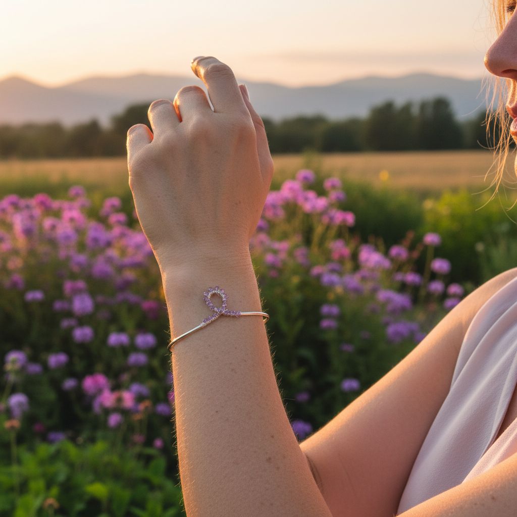 This exquisite handmade Lavender Crystal Cancer Ribbon Awareness Bangle isn't just a fashion choice—it's a powerful symbol of hope, strength, and support. Whether you're wearing it for yourself as a survivor, in honor of a loved one, or to raise awareness, this stunning sterling silver ribbon-shaped bangle will ignite inspiring conversations and uplift spirits.
