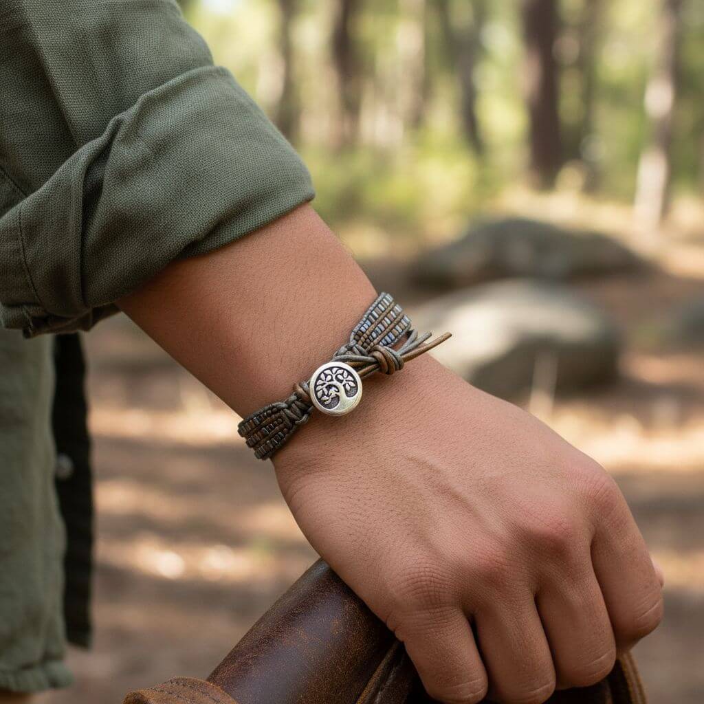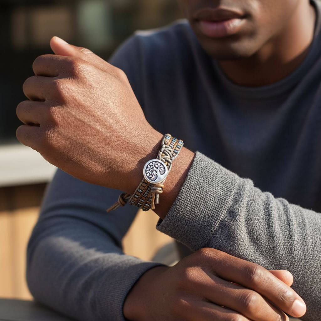 ✨ Men's Leather Wrap Bracelet Tree of Life Intricately Beaded