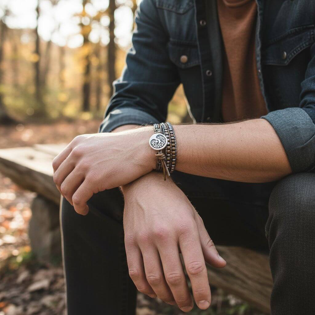 Make a bold statement with this stunning handmade hammered metal jewelry piece – where rugged masculinity meets artisan craftsmanship. This exceptional triple-wrap leather bracelet features an intricately beaded Tree of Life design with natural gemstones, creating a unique accessory that's both meaningful and stylish.