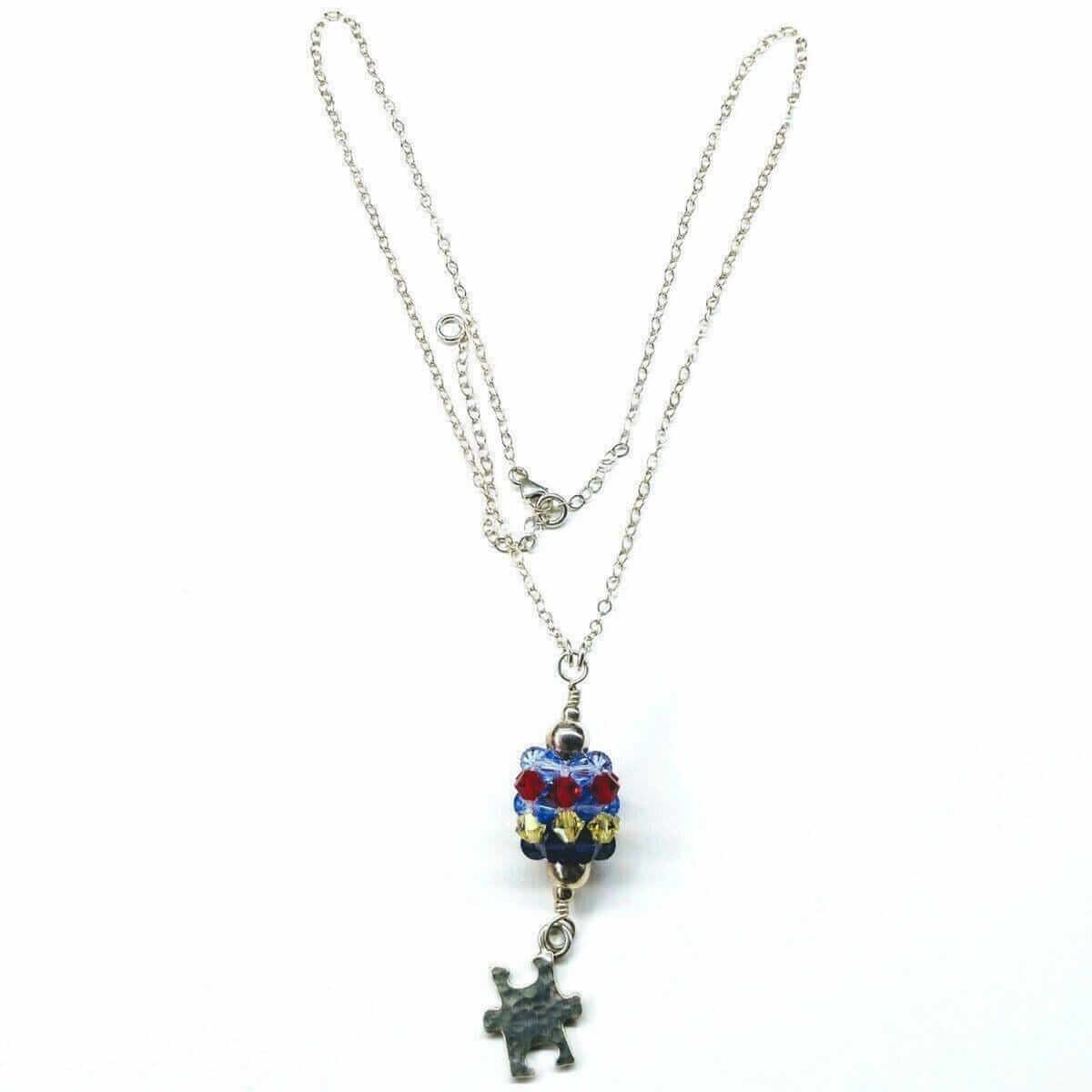 Raise Awareness differently and in style with sterling silver Autism Awareness Crystal colored barrel pendant with a hammered puzzle piece charm. Adjustable necklace