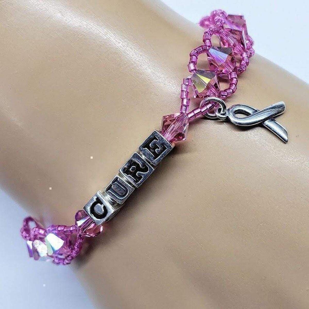 Handmade Beaded Crystal Breast Cancer Awareness Bracelets. Each of the gorgeous pink bead-woven awareness bracelets is made with sparkly pink Swarovski Crystals and silver-lined pink Delicas Seed beads and all metal components are 925 sterling silver. Bracelet is available with pre-selected words only.