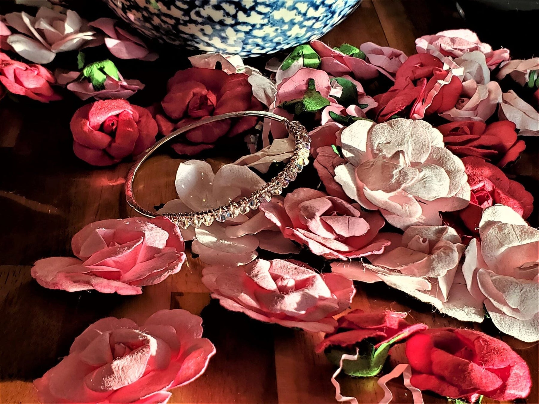 "I love combining sterling silver and copper in my designs because the contrast between cool silver and warm rose-gold copper creates such visual interest. The embossed pattern on the silver bangle adds texture, while the wire-wrapped Swarovski crystals bring sparkle and movement. This is one of my favorite pieces for brides and special occasions—it's elegant, sophisticated, and truly one-of-a-kind."