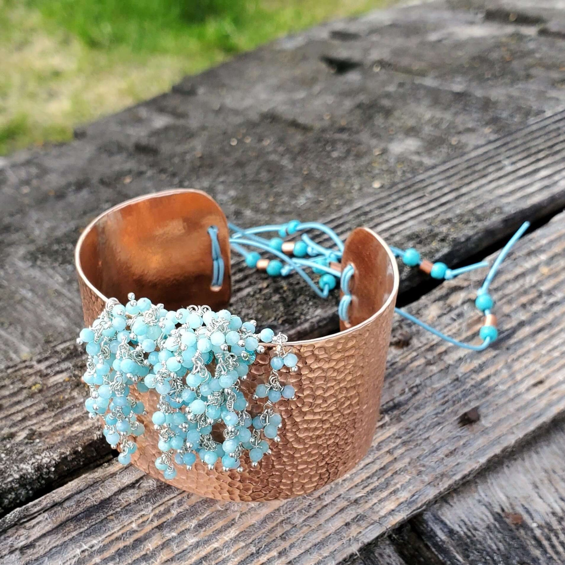 Large Super Wide Cuff - $138: A true investment piece. The 1 5/8" width is dramatic and rare. The hundreds of amazonite dangles, sterling silver wire wrapping, leather beaded fringes and substantial 2-ounce copper construction make this museum-quality wearable art.