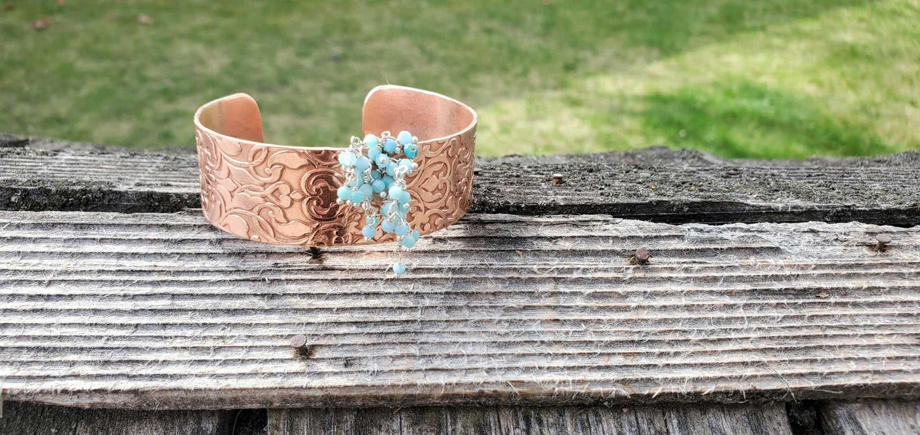 Wide Cuff (0.75"): Features Victorian flower embossed design - an elegant, vintage-inspired pattern pressed into the copper. Romantic, detailed, and sophisticated.