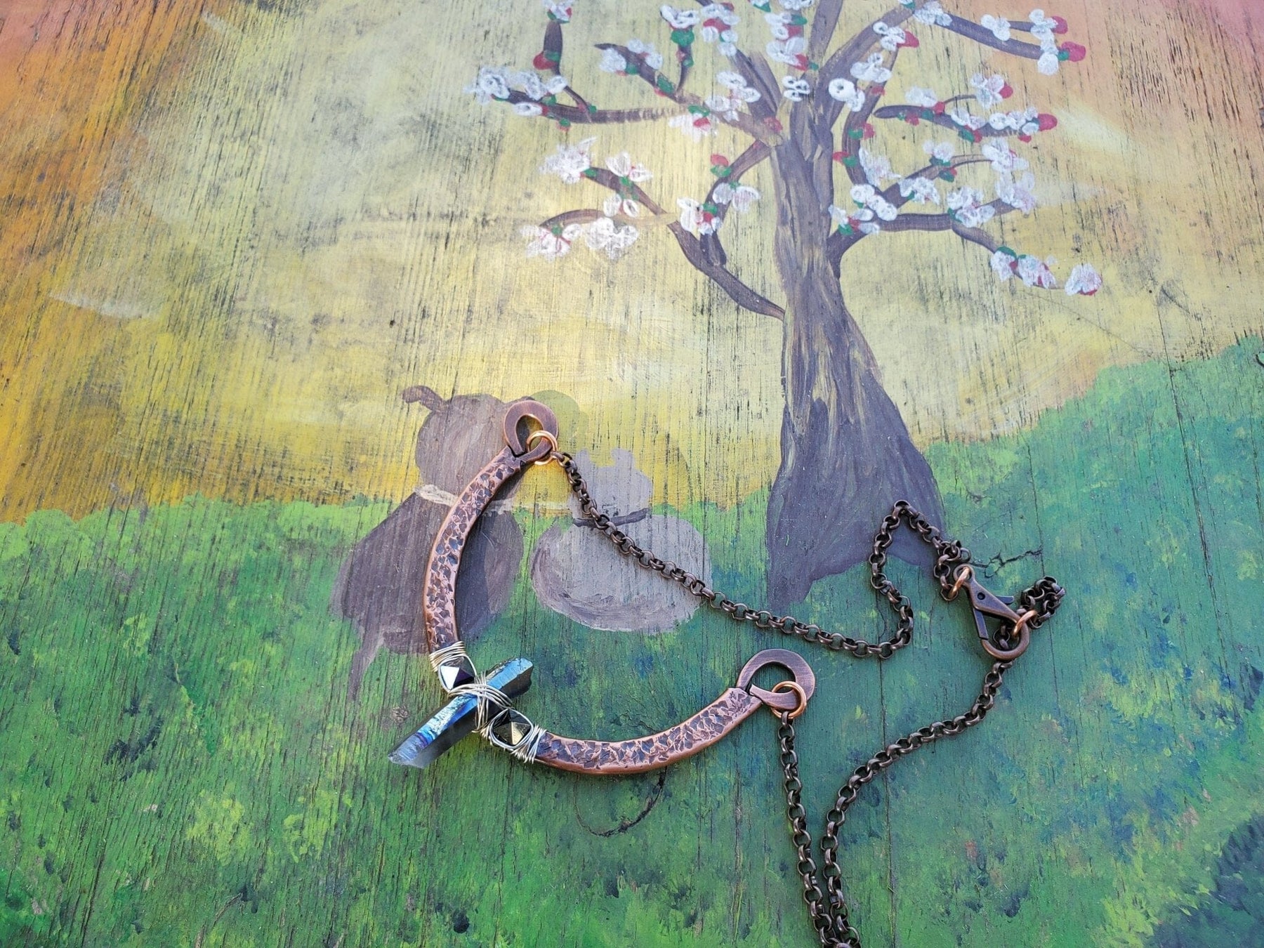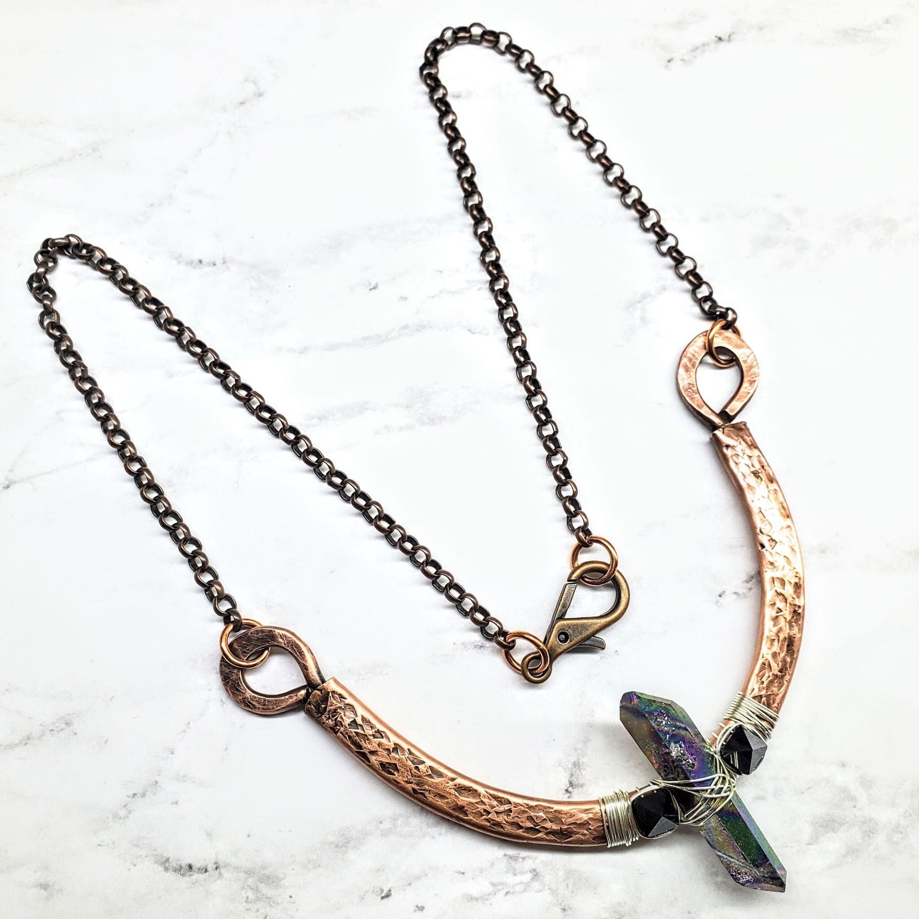 - Pendant: Hand-hammered sculpted copper guard with wire-wrapped crystals