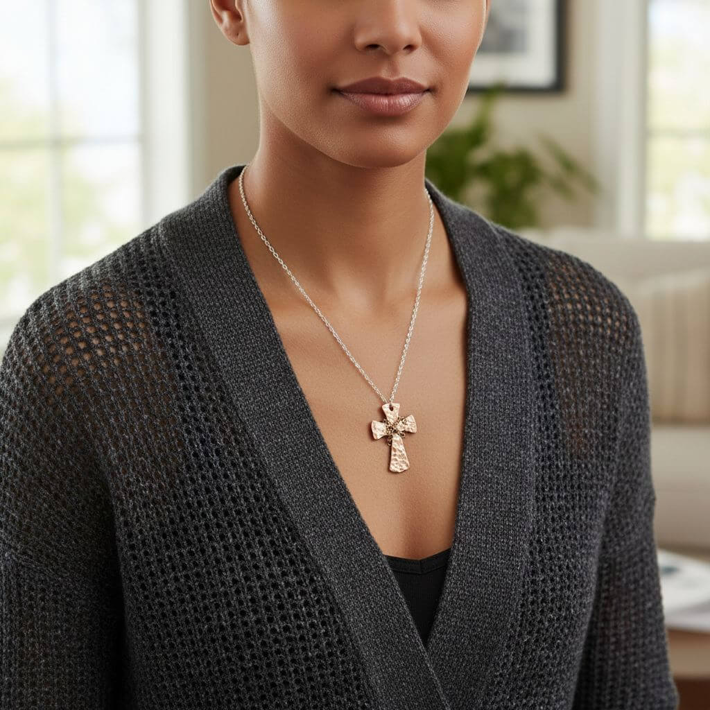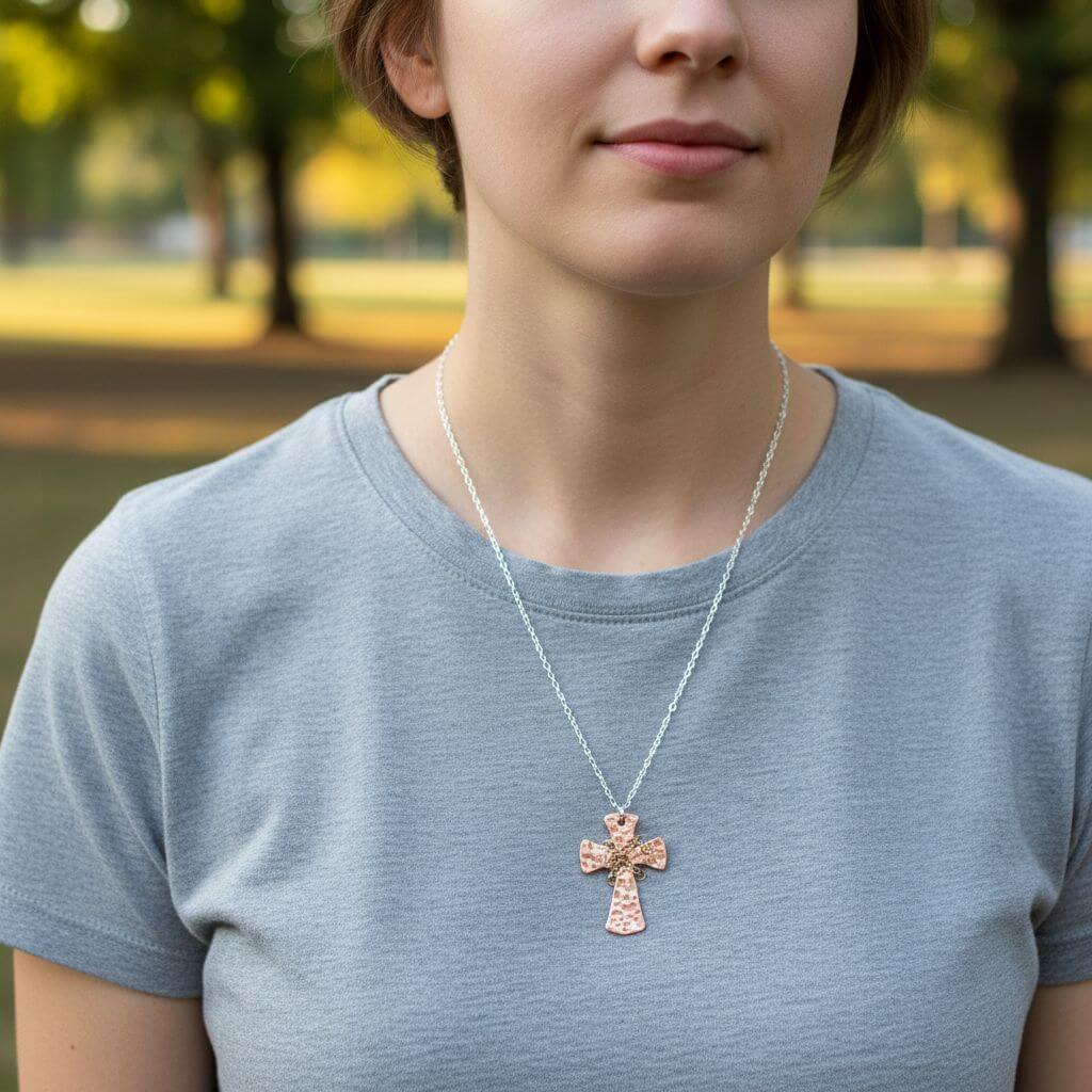 Women love this cross necklace too! The artisan hammered texture and mixed metals create a bohemian, rustic elegance that pairs beautifully with everything from casual tees to flowing dresses. The 18-inch length is perfect for layering or wearing solo as a meaningful statement piece.
