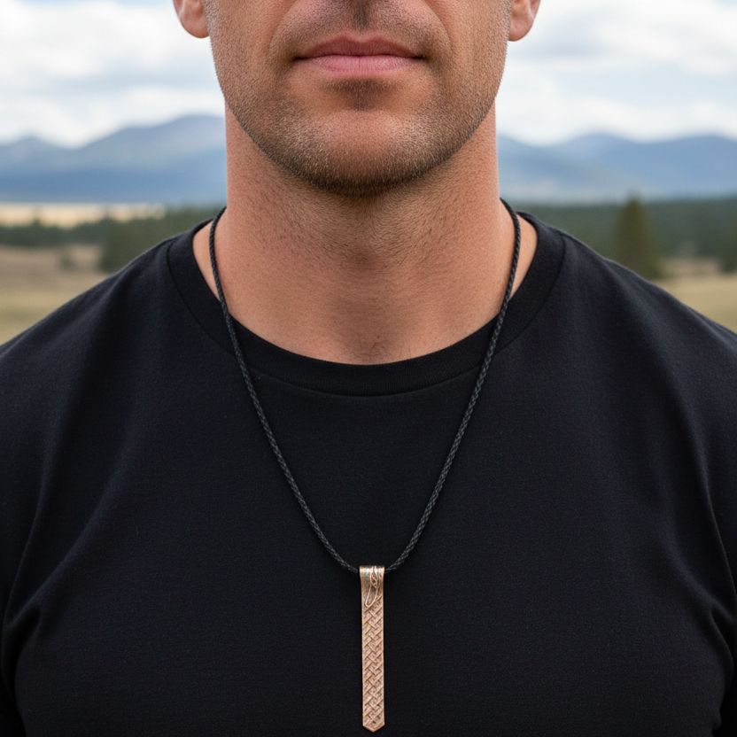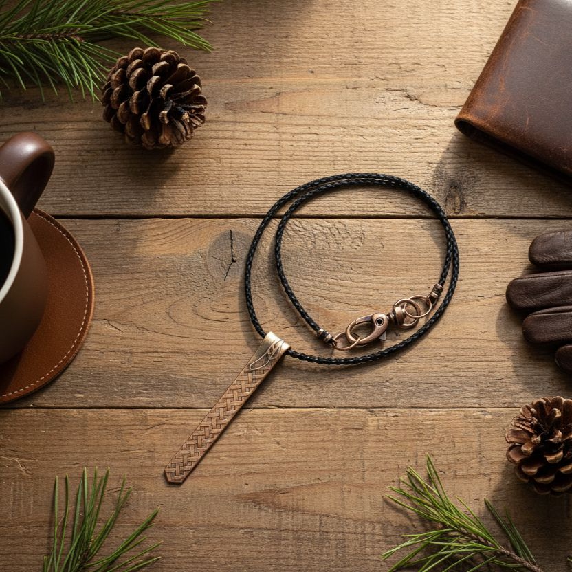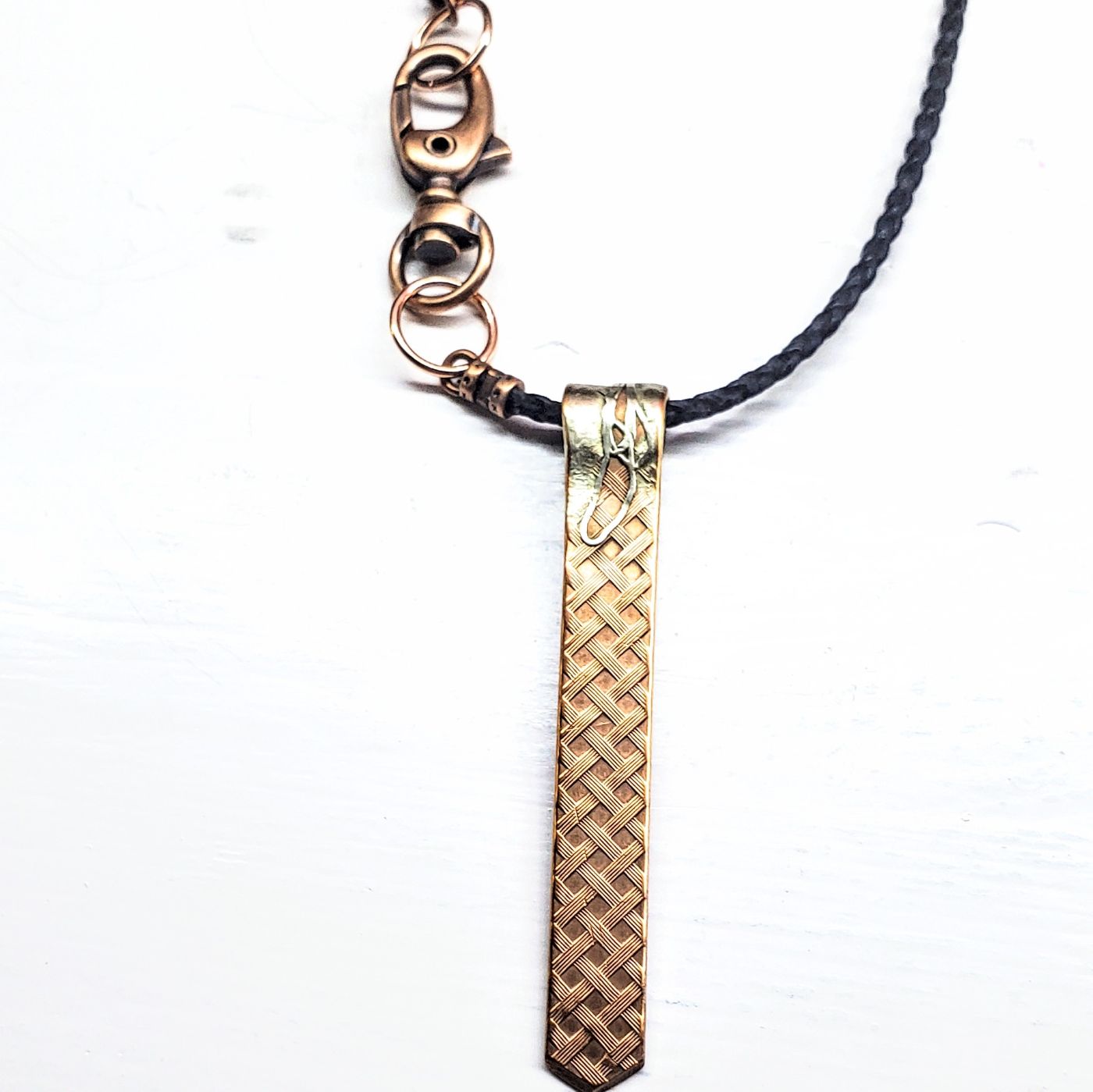 Dare to stand out with our striking Copper Weave Embossed Necktie Pendant Necklace—a handcrafted treasure that brings spa-inspired luxury and fearless masculine style to every occasion. This unique necklace features a bold copper necktie pendant with an interlocking weave pattern embossed into the surface, creating architectural geometry that catches light with every movement. Adorned with oxidized sterling silver soldered accents and suspended from a durable black braided cotton cord, this piece is designed for those who refuse to blend in and demand jewelry as fearless as they are.