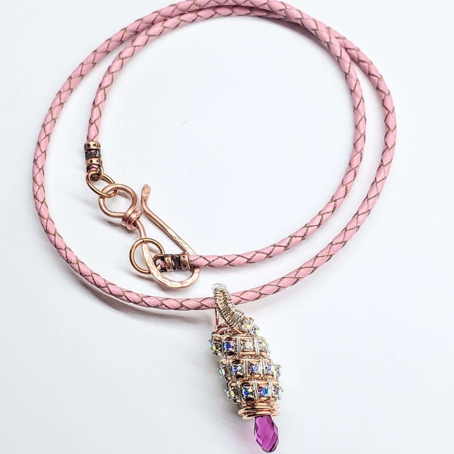Pendant Construction: The tubular wire coiled pendant is meticulously handcrafted using copper and sterling silver wire. Each wire is individually coiled to create the dimensional tubular structure, then carefully shaped to frame and showcase the brilliant fuchsia crystal drop.