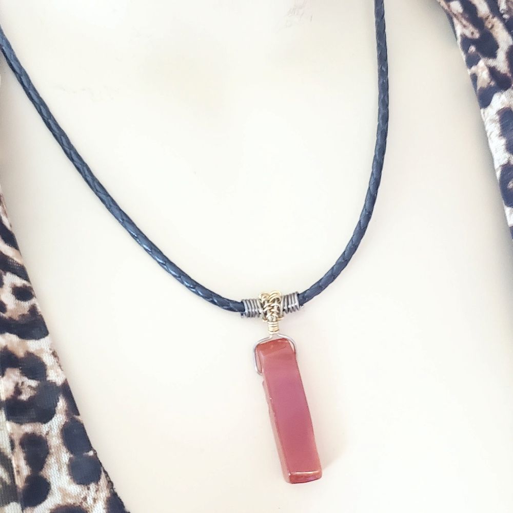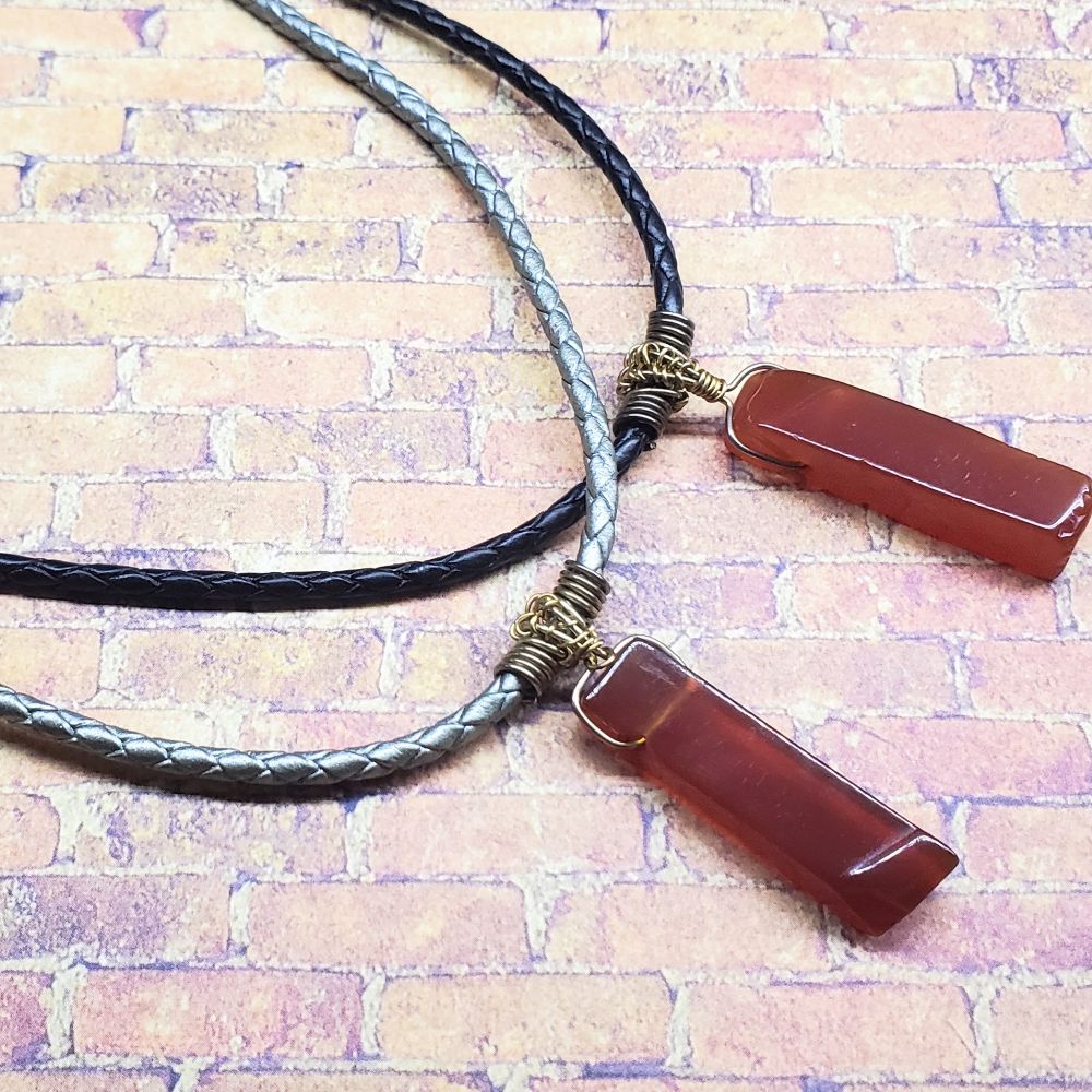 Experience the natural beauty of raw red agate with these handmade wire-wrapped bolo leather necklaces. Each necklace showcases a unique stick-shaped agate stone, carefully wrapped to highlight its rustic charm. The bolo leather cord ensures a comfortable fit for any style. Perfect for adding an earthy, handcrafted touch to your everyday look or gifting someone special a piece of nature’s art. Embrace individuality and timeless elegance with these one-of-a-kind necklaces. The length is 20 inches