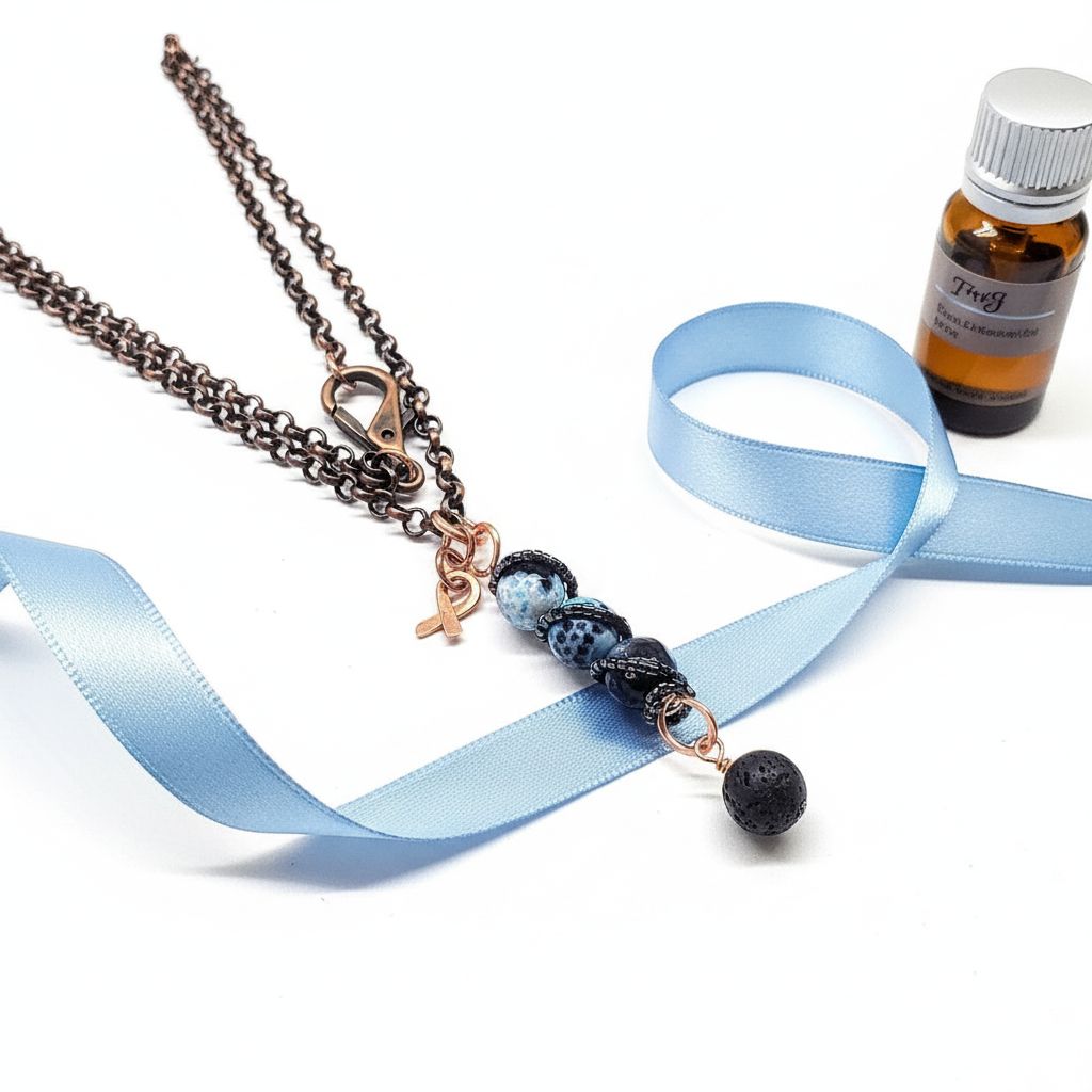 This isn't just jewelry—it's a statement of hope, healing, and advocacy. Each Child Abuse Awareness Agate Necklace With Lava Rock Bead is individually hand-sculpted, creating unique surface patterns that catch the light beautifully. The three sparkling blue agate beads represent the blue ribbon symbol of child abuse awareness and prevention. The copper awareness ribbon charm reinforces your support for the cause. The lava rock bead serves dual purposes: it's a powerful grounding stone and can be used for aromatherapy by adding your favorite essential oils. This handmade artisan jewelry piece serves as both a beautiful accessory and a powerful conversation starter for this important cause.