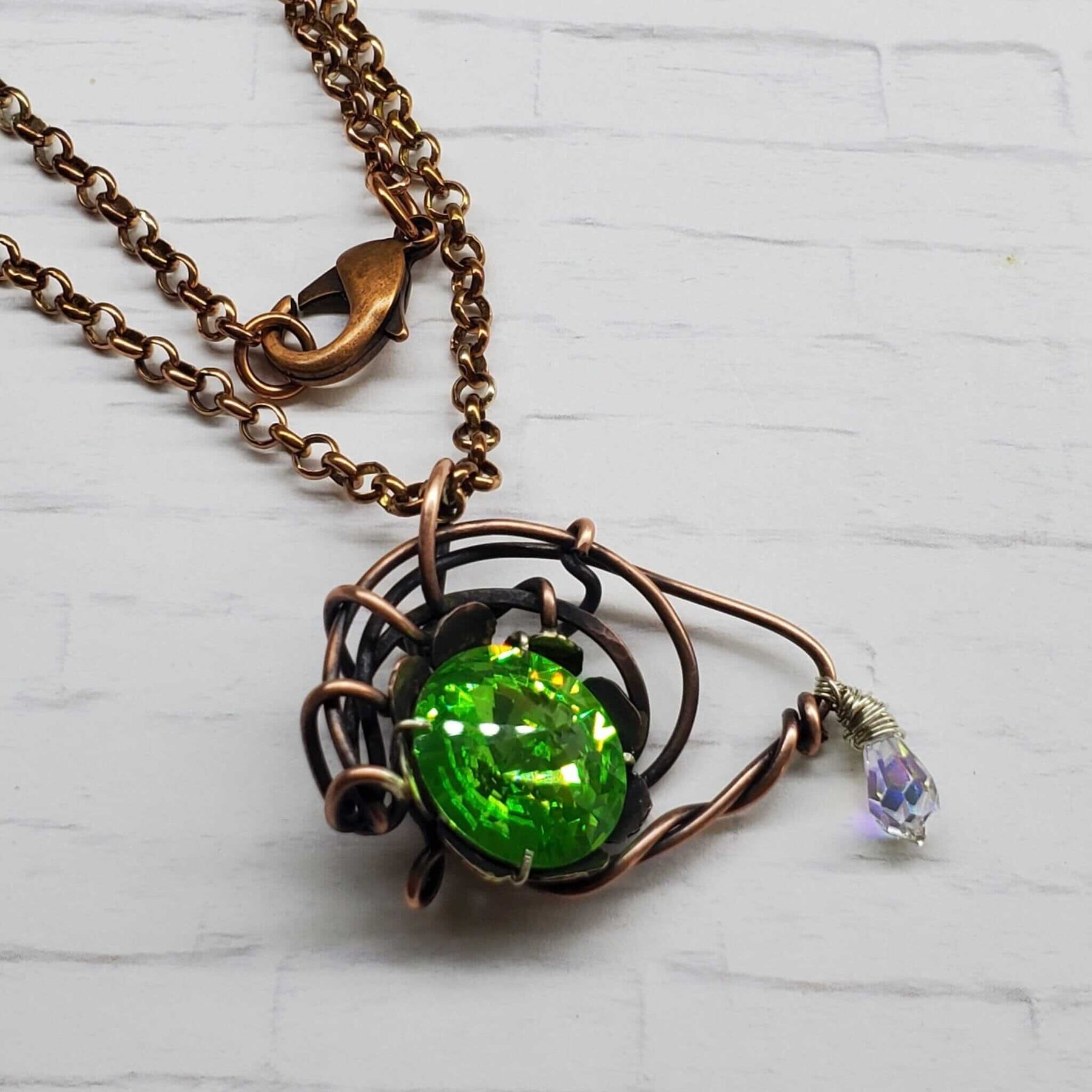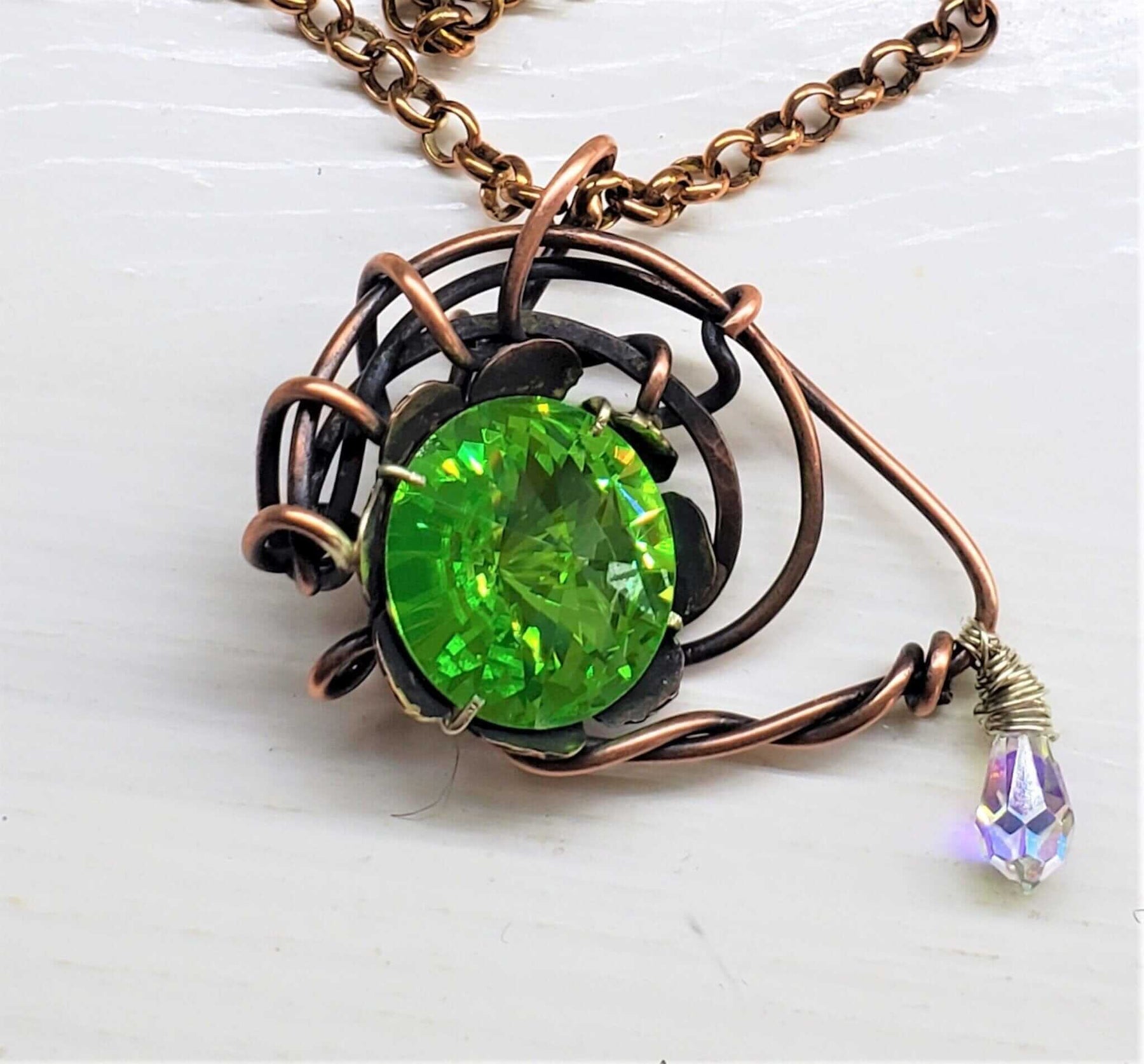 Materials: Copper wire, genuine Swarovski Rivoli crystal (peridot green)