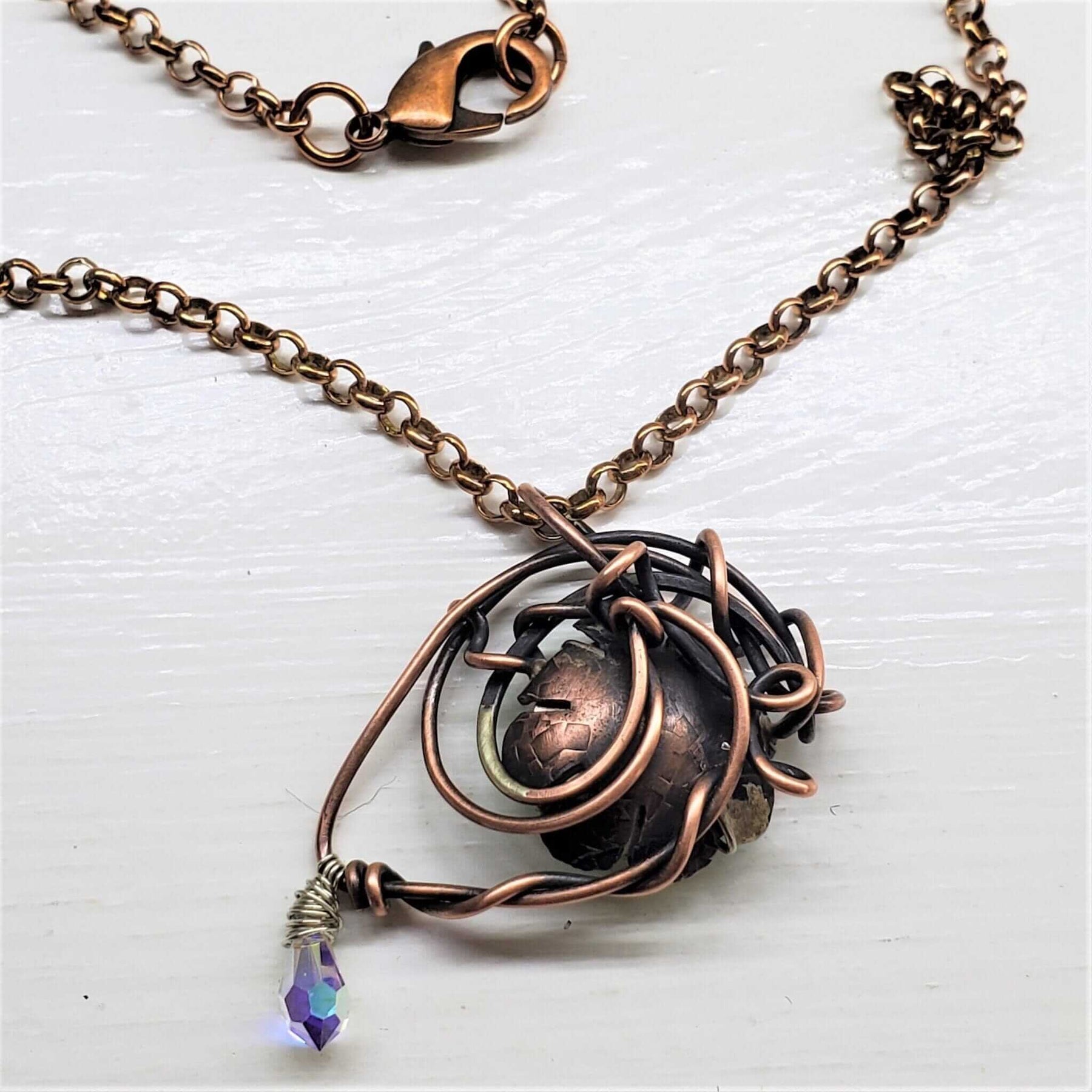 Your copper necklace will develop a beautiful natural patina over time, adding character and depth to the rose-gold color. Embrace the warm, antiqued look or polish with a copper cloth to restore bright shine. Both looks enhance the artistic quality of this piece.