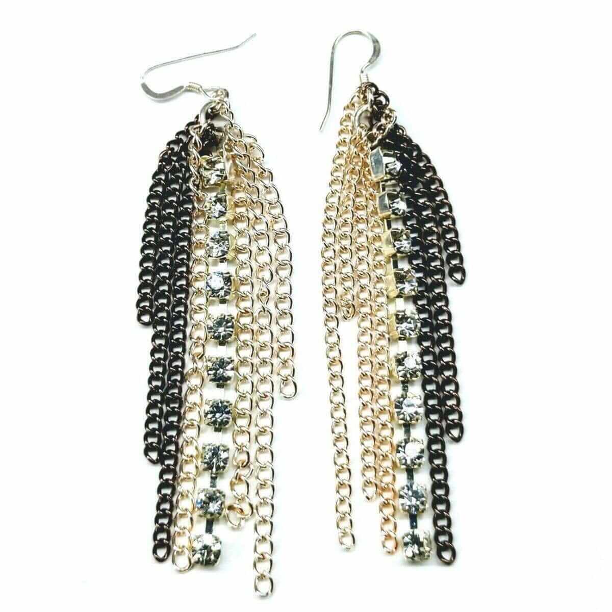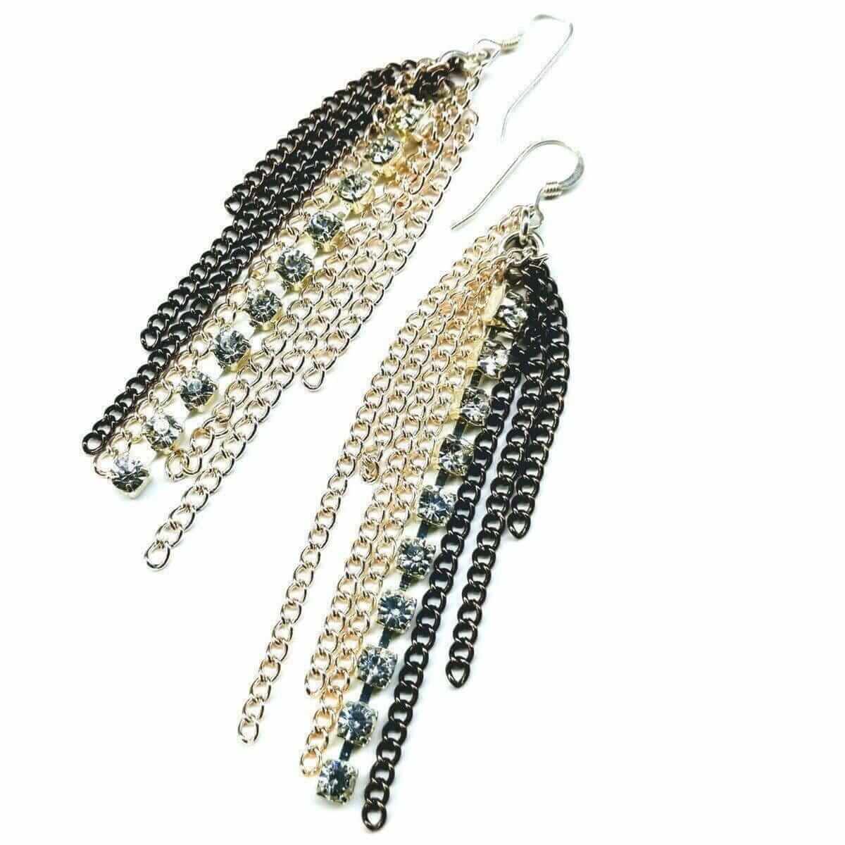 These handcrafted earrings are made from several different lengths of color enameled chain in light rose and mocha. Featuring a super sparkly long rhinestone in between the chains adding elegance and class to these earrings.