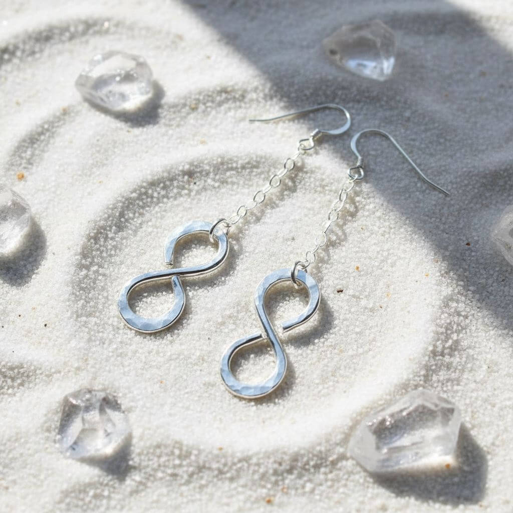 These Handmade Hammered Metal Jewelry earrings showcase the infinity symbol—a timeless emblem of eternal love, limitless possibilities, and unbreakable bonds. The hand-hammered texture gives each curve organic character and artisan authenticity, while the polished sterling silver gleams with luxurious brilliance.