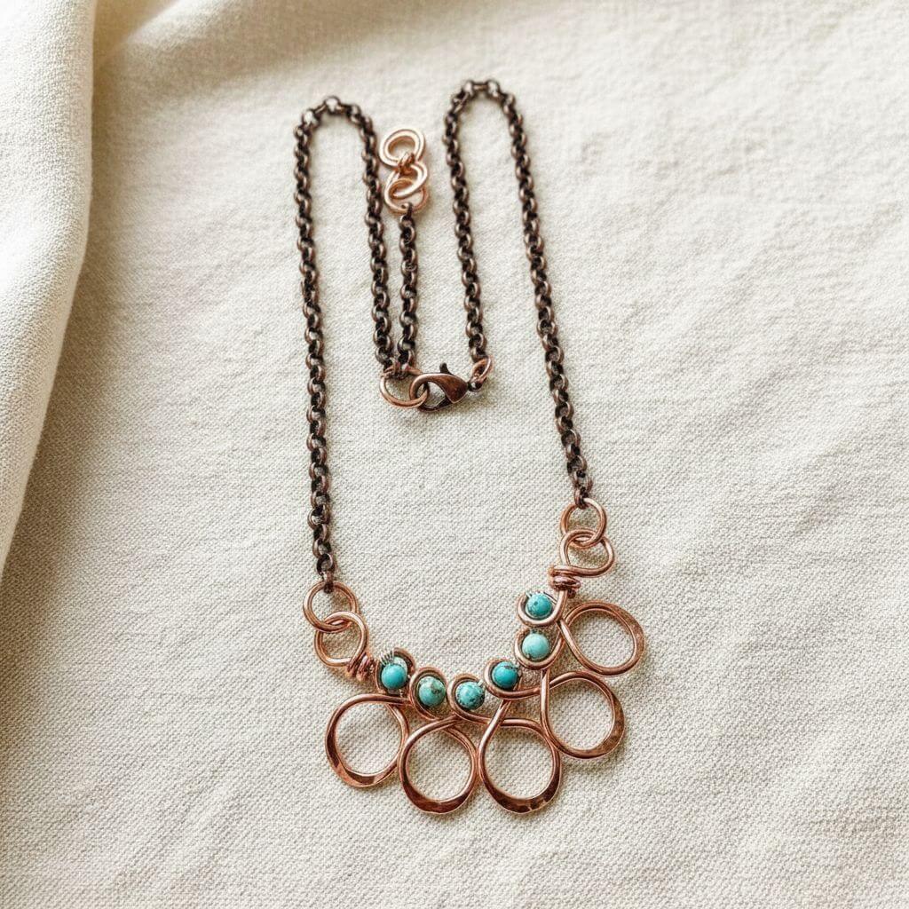 This wire-sculpted necklace embodies effortless boho-chic elegance. Wear it with flowing maxi dresses for festival-ready looks, pair it with denim and leather for southwestern style, or let it add artisan flair to your work wardrobe. The 18-inch length sits beautifully at the collarbone, making it perfect for layering or wearing solo as a statement piece. The substantial copper centerpiece creates visual impact while the turquoise beads add pops of color that work with virtually any outfit.