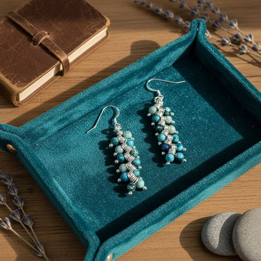 Each pair is meticulously handcrafted in our Montana studio using premium handmade artisan jewelry techniques. We hand-select genuine turquoise gemstone beads in complementary shades ranging from light aqua to deep teal and midnight blue, then individually wire-wrap each bead onto sterling silver wire using traditional techniques. The result is a stunning cluster earring with incredible movement and dimension. Sterling silver French hook ear wires ensure comfortable, secure wear. Every bead placement is intentional, creating a balanced, beautiful design.