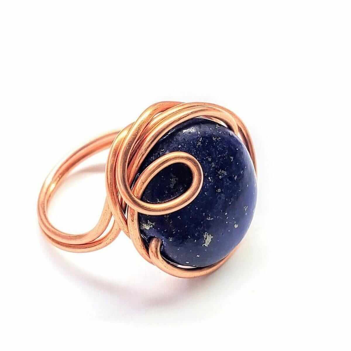 Every wire tells a story. This one-of-a-kind ring features a genuine lapis lazuli gemstone wrapped in hand-formed copper wire, creating an organic, bohemian design that's as unique as you are.