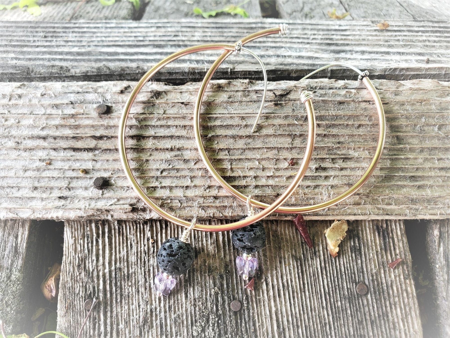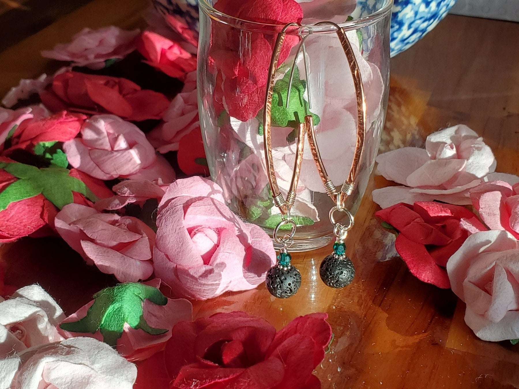 Materials: Hammered copper, sterling silver, natural gemstones, lava stone, crystals
