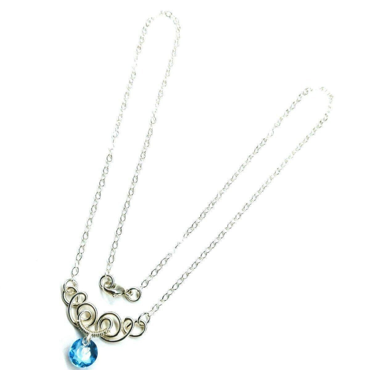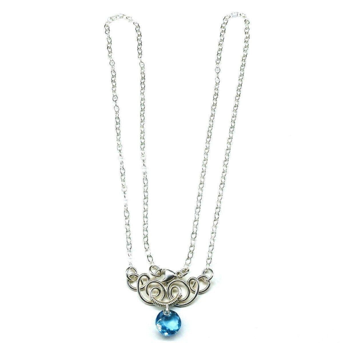 Silver Wire Sculpted Round Aqua Crystal Pendant Necklace