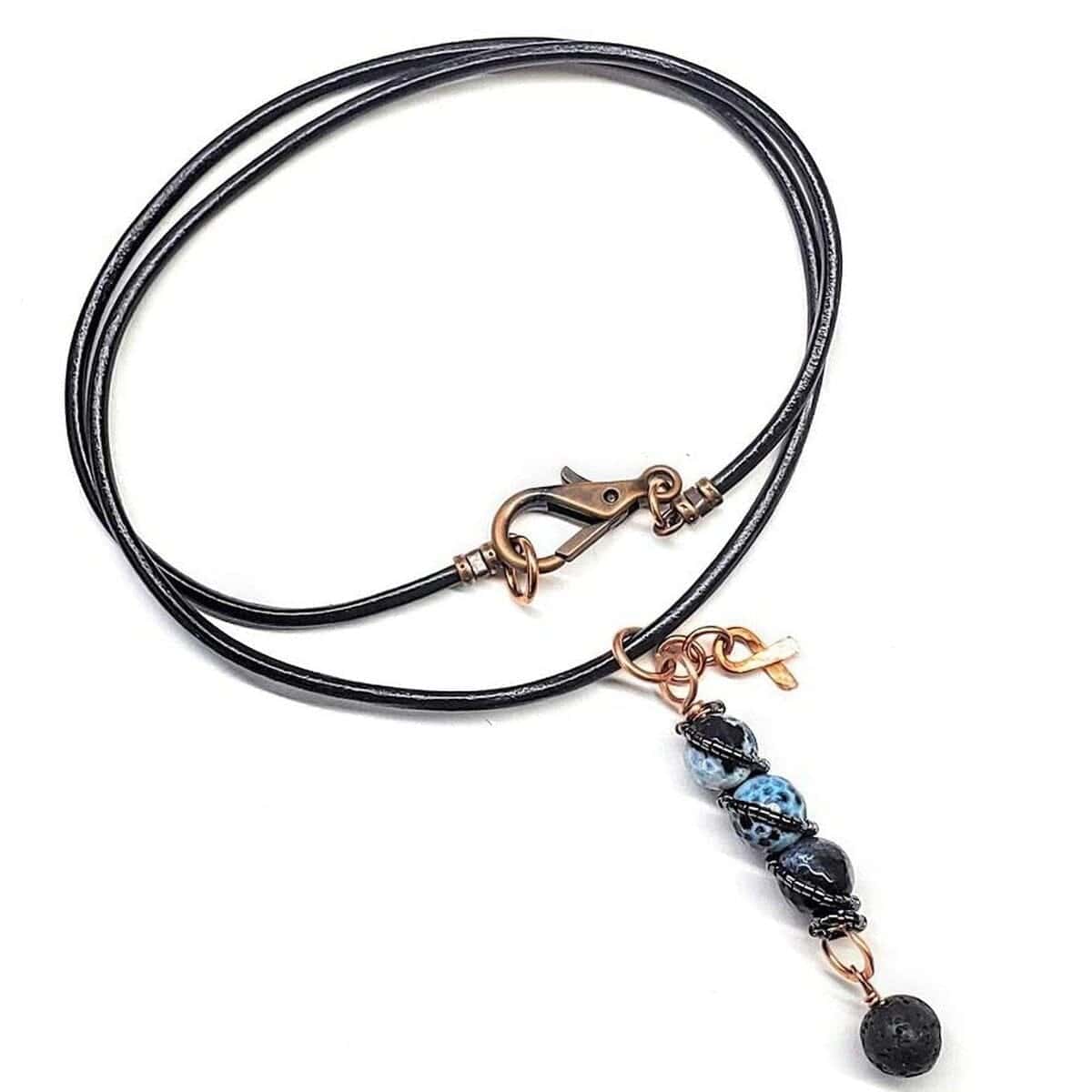 This stunning pendant was designed to symbolize Child Abuse Awareness, featuring a hand-sculpted copper spiral wrapped around a beautiful blue agate gemstone bead with tiny black seed beads spiraling around the design, plus a dangling lava rock charm and copper awareness ribbon charm. Wear it as a symbol of hope, healing, and protection for vulnerable children.