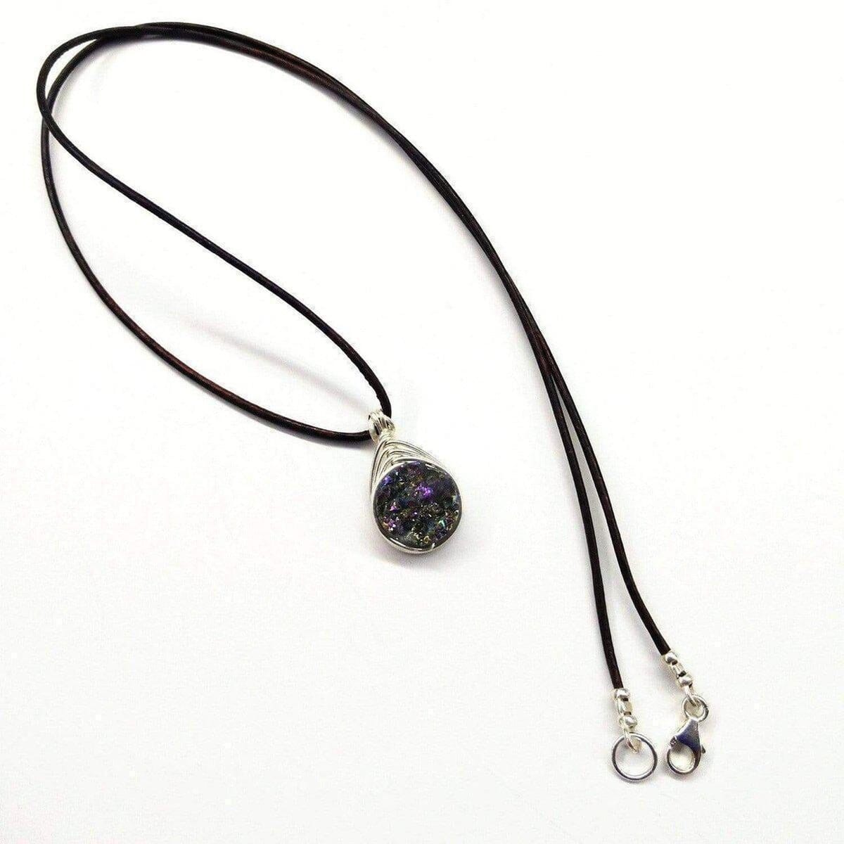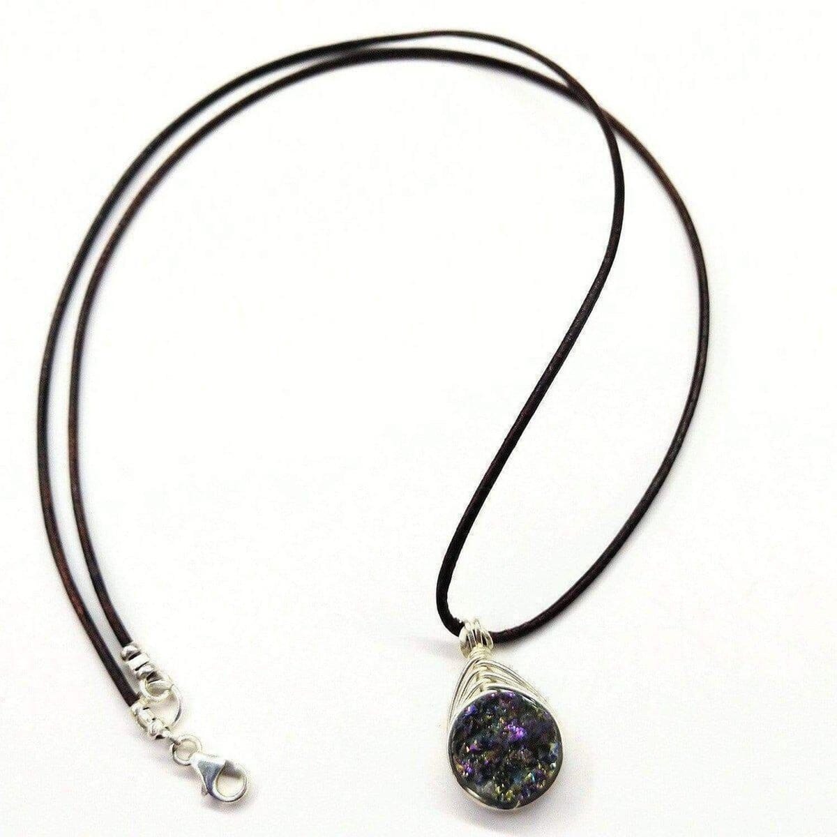 This stunningly crafted necklace features an exquisite herringbone wire wrap pendant set with a dazzling rainbow-hued Titanium Druzy Agate bead. Hanging gracefully from a delicate leather cord, the 18-inch necklace is fitted with sterling silver end caps and a lobster clasp for a secure hold. An amazing sparkly piece of jewelry for any special occasion!
