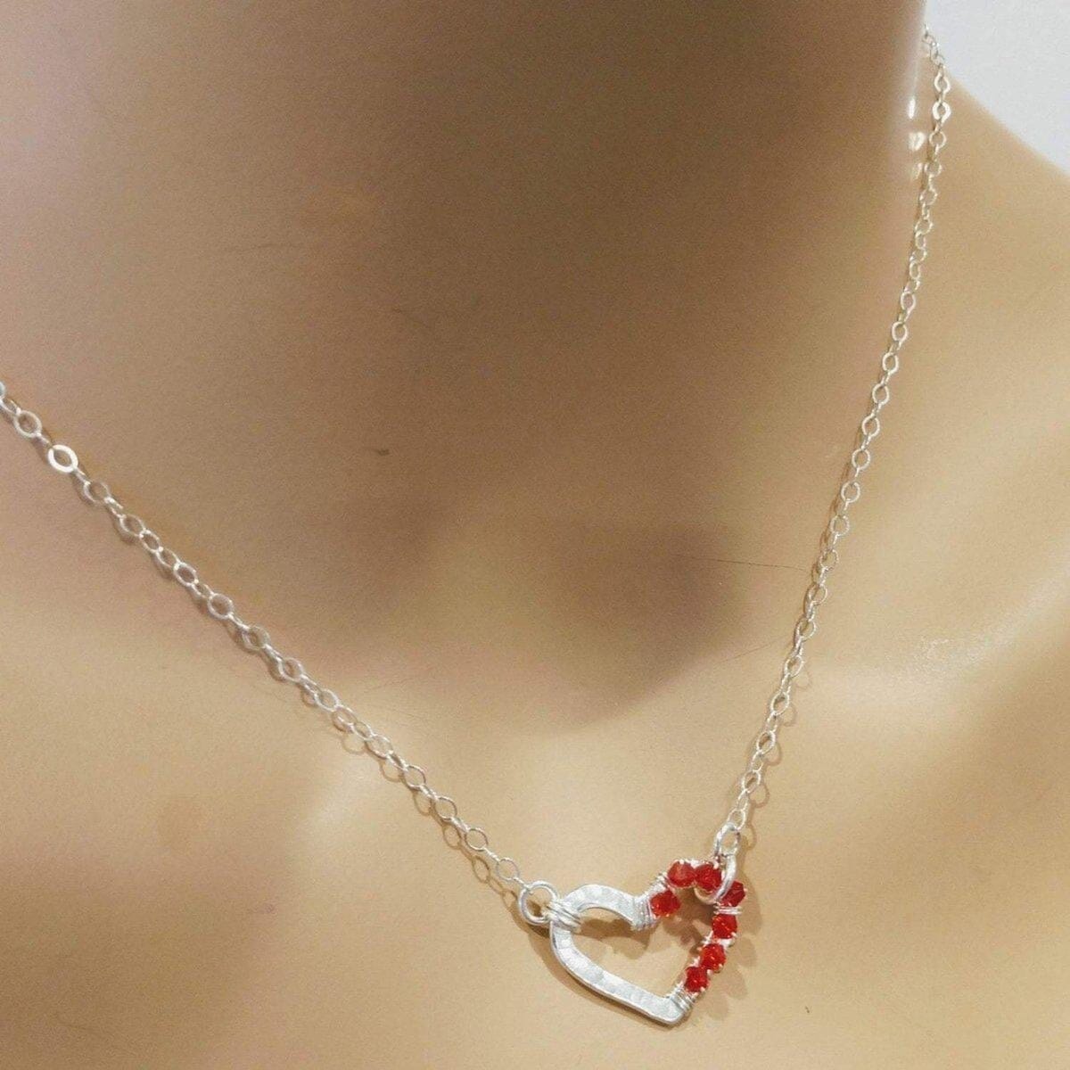 Show your everlasting love with this precious partially wire wrapped sterling silver heart hammer forged and sculpted necklace. Each heart is shaped and forgerd carefully and then hammered to receive this multifacet reflection in the light. Red sparkly crystals are wrapped around one side of the heart. Length 18 inches only.