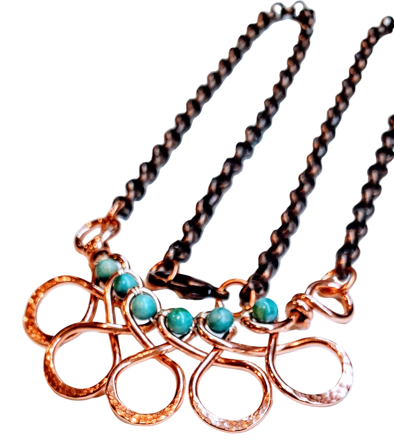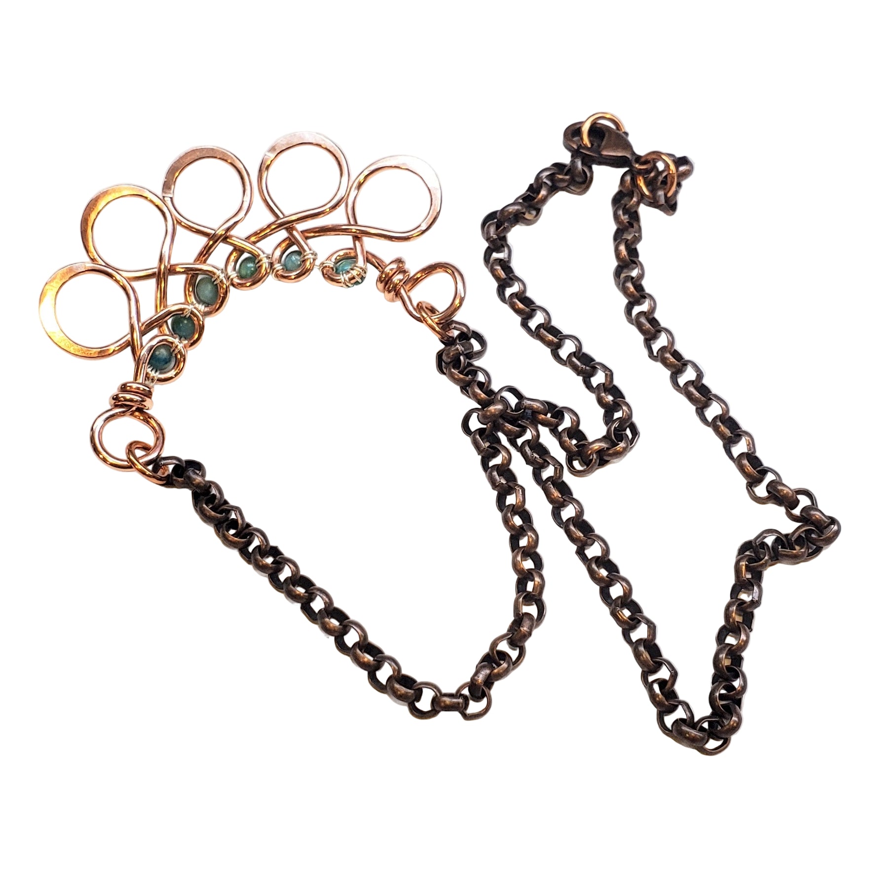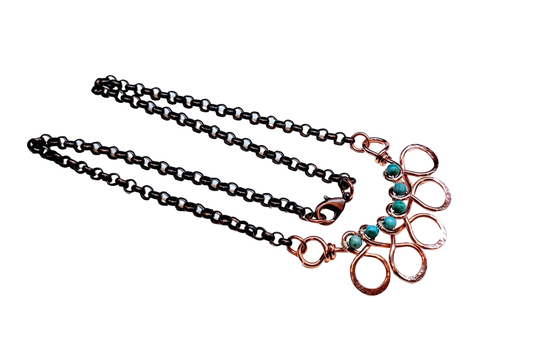 Gorgeous handcrafted (As Seen on Ashley Liao - who plays in Fuller House) copper turquoise wire wrapped necklace. This earth-friendly necklace features a wire sculpted solid copper wire looped middle piece  which upper loops have been silver wire wrapped with small turquoise jasper gemstone beads, The middle piece connects to a sturdy Rollo Chain necklace of 18 inches