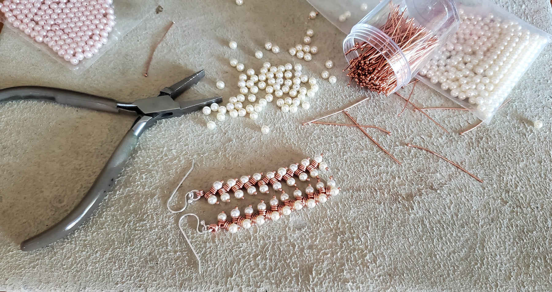 - Each of the 40 Swarovski pearls is hand-coiled onto a copper headpin